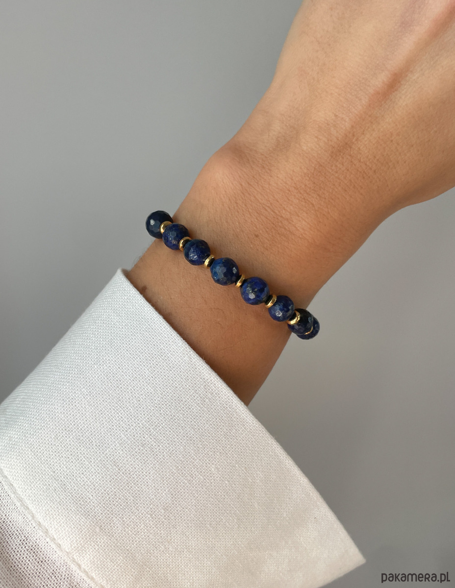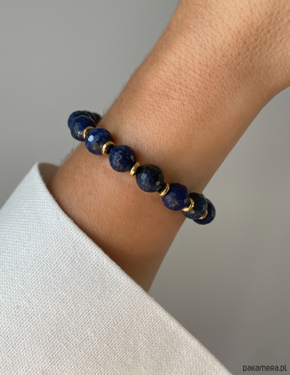 Cechy bransoletki:Kamień: lapis lazuli, hematyt (kolor złoty)Wielkość kamienia lapis lazuli kształt kamienia: kulki fasetowane ok. 8 mm Wielkość kamienia hematyt: ok. 3 mm Kolor: granatowy, złoty Materiał: wytrzymała elastyczna żyłka jubilerska