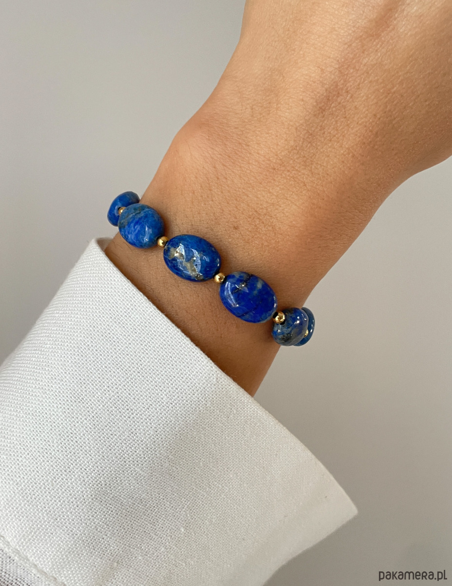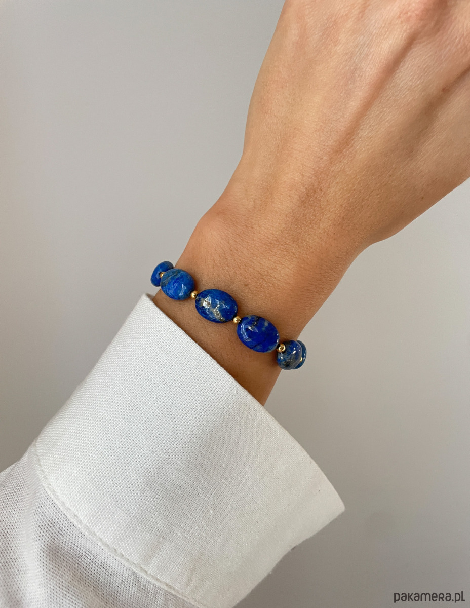 Cechy bransoletki:Kamień: lapis lazuli, hematyt (kolor złoty)Wielkość kamienia lapis lazuli kształt kamienia: oval ok. 10x14 mm Wielkość kamienia hematyt: ok. 3 mm Kolor: granatowy, złoty Materiał: wytrzymała elastyczna żyłka jubilerska