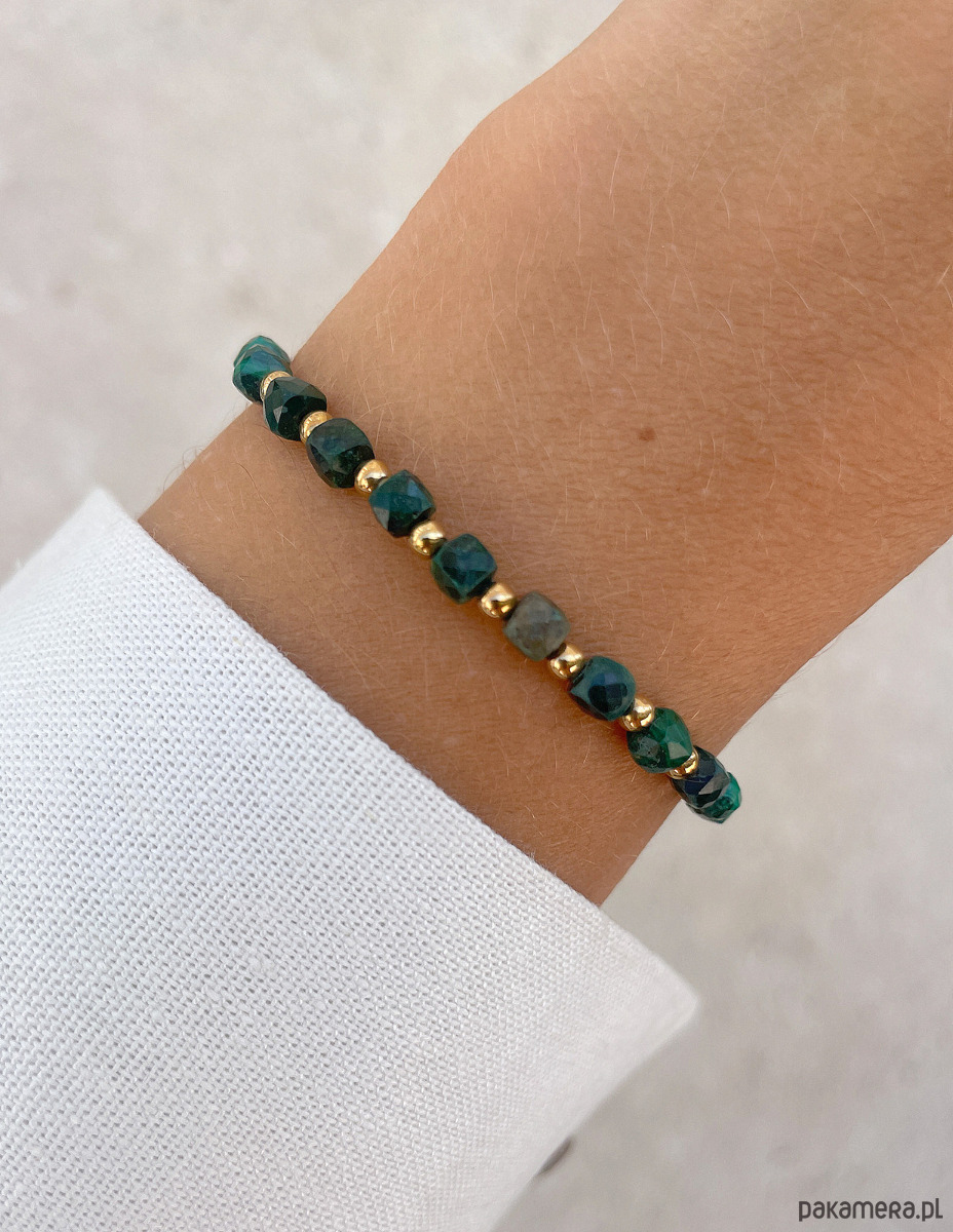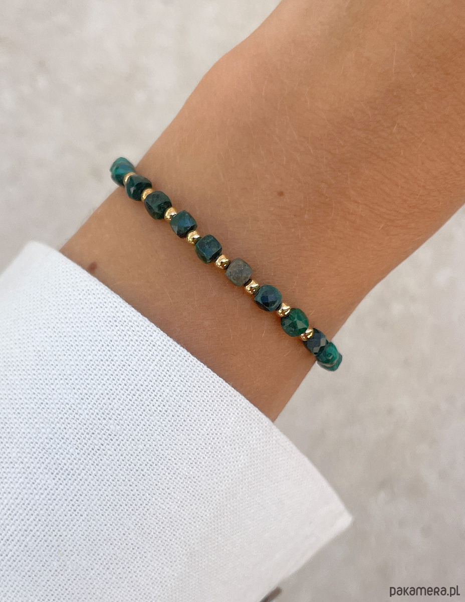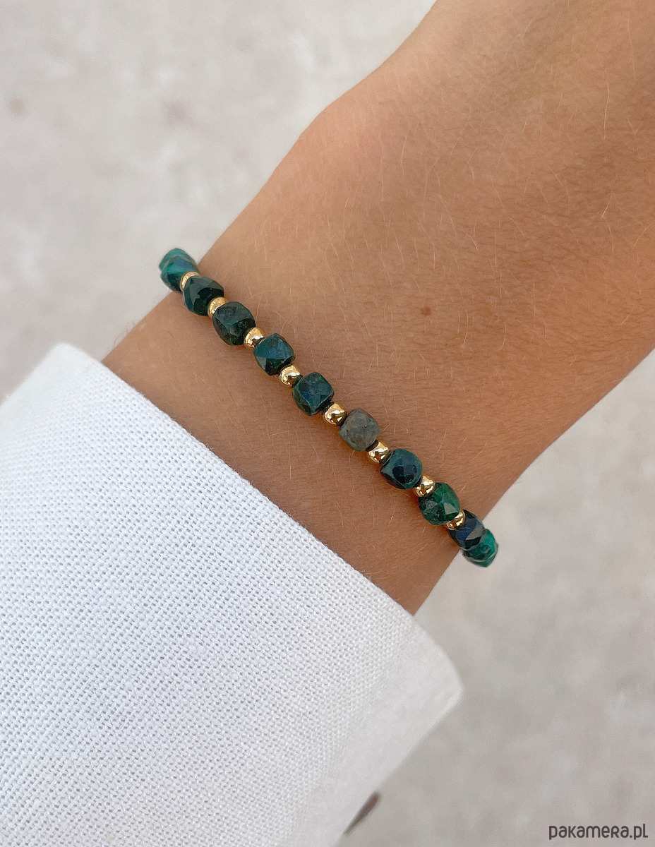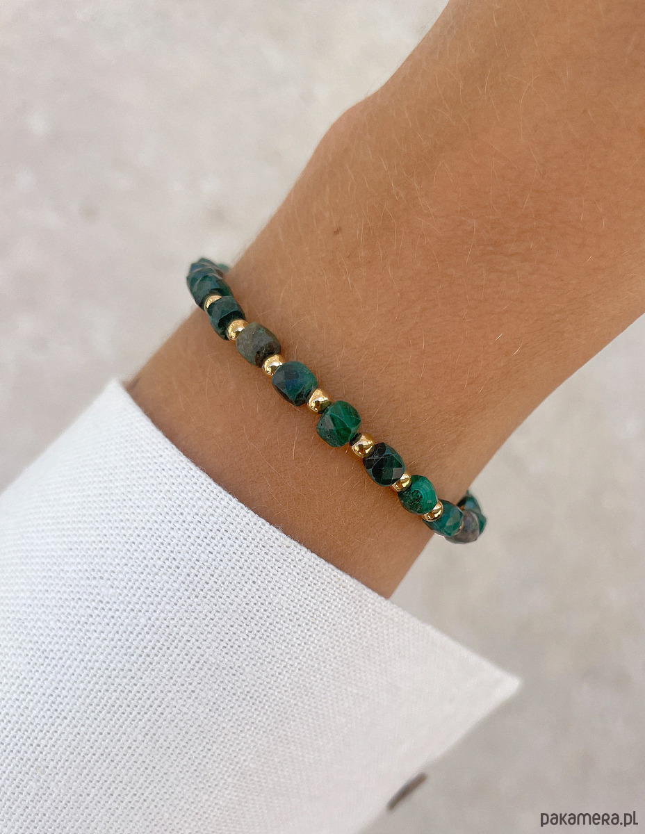 Bransoletka została wykonana z fasetowanych kostek malachitu o wymiarach około 4 mm. Ich powierzchnia zachwyca niepowtarzalnymi, zielonymi odcieniami i charakterystycznymi, pływającymi wzorami, co sprawia, że każdy kamień jest jedyny w swoim rodzaju. Wzór dopełniają lśniące, złote kuleczki z hematytu o średnicy około 3 mm, które nadają całości wyrafinowanego i nowoczesnego charakteru. Dzięki wykorzystaniu wytrzymałej, elastycznej żyłki jubilerskiej, bransoletka jest nie tylko piękna, ale także niezwykle komfortowa w noszeniu.