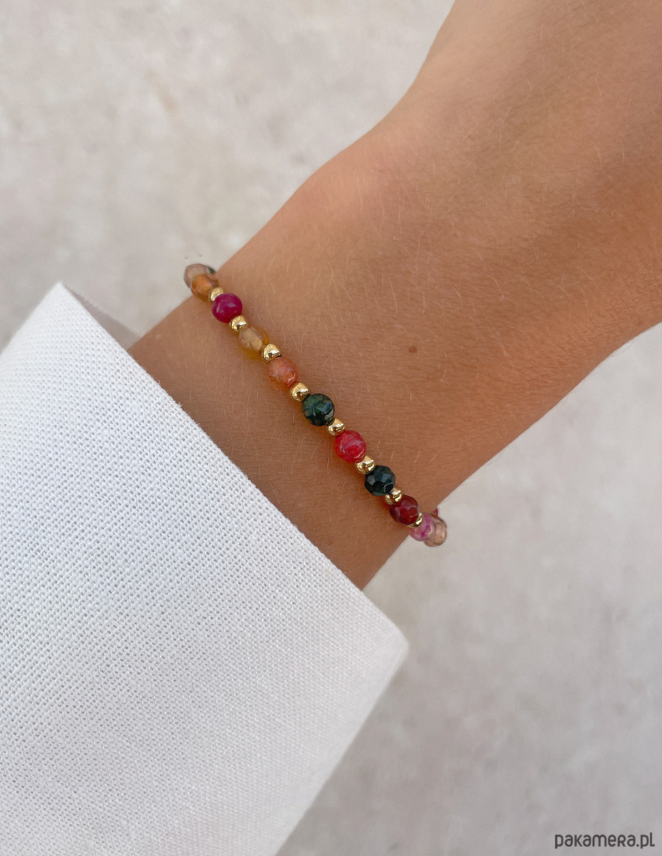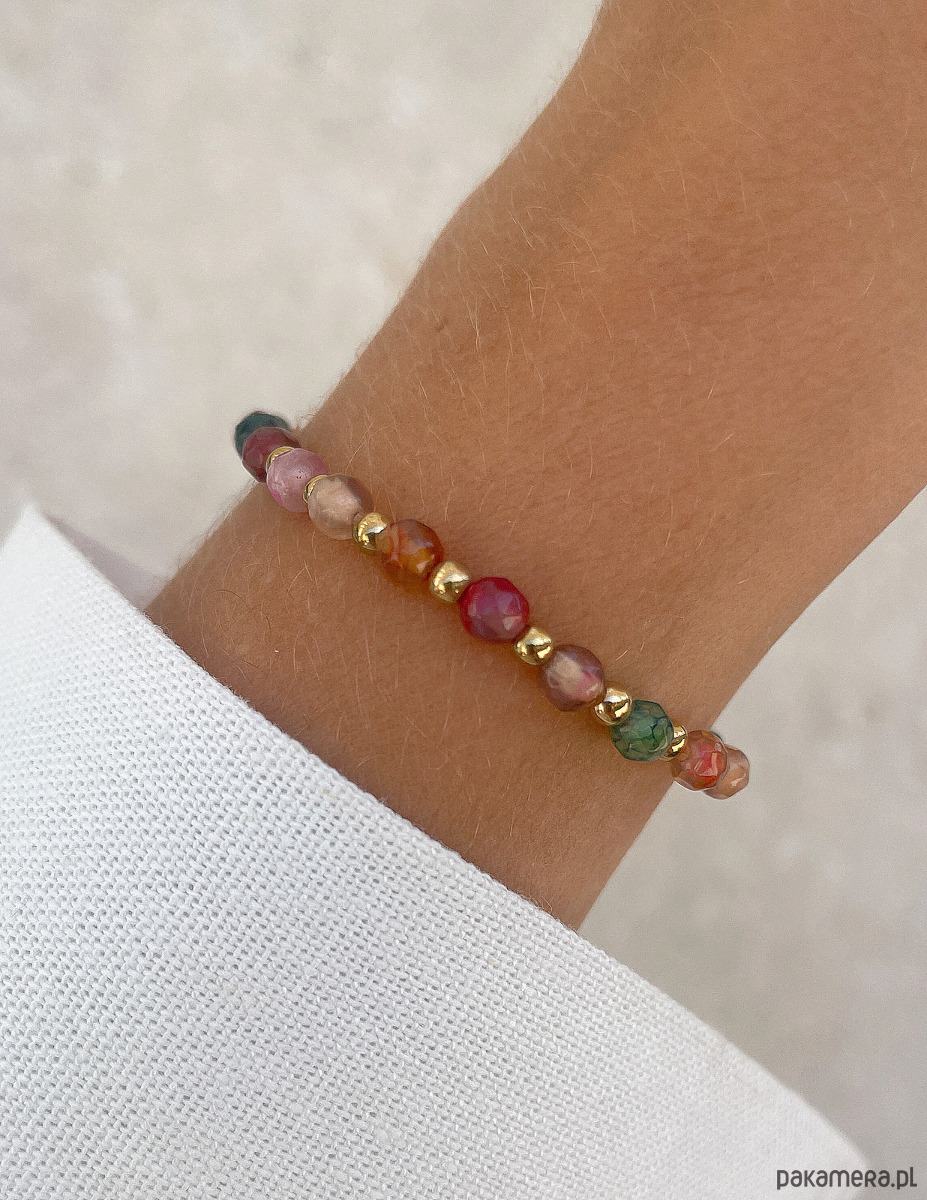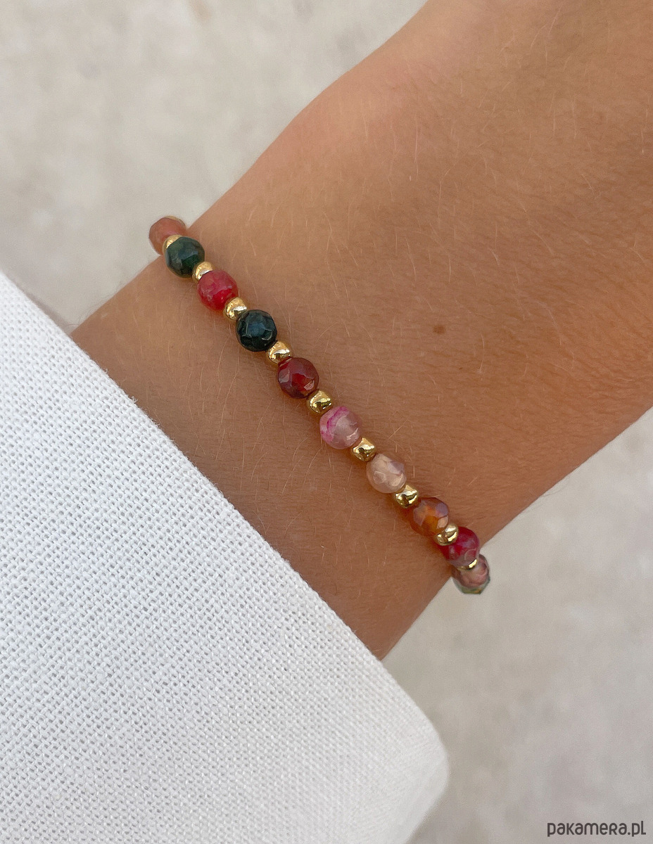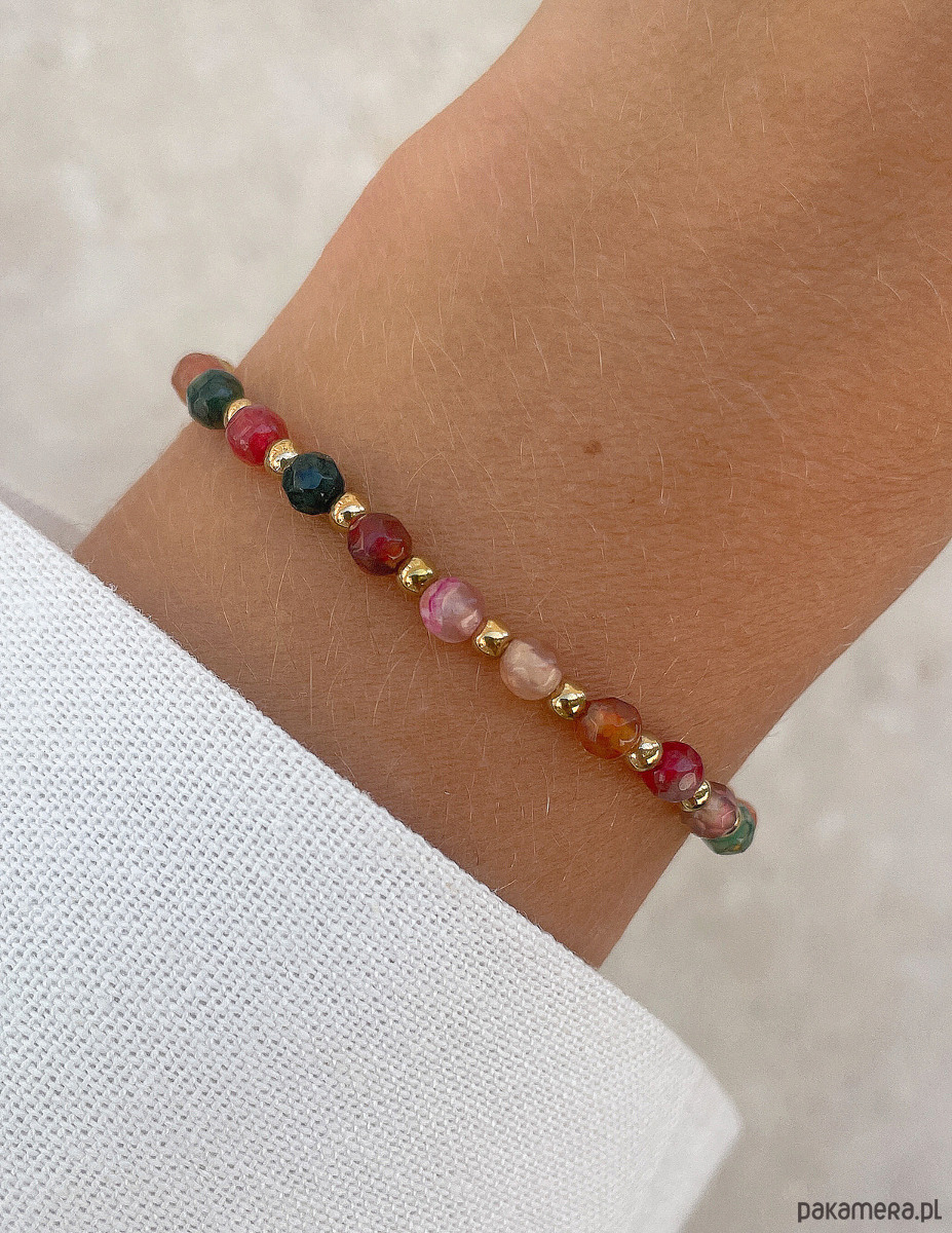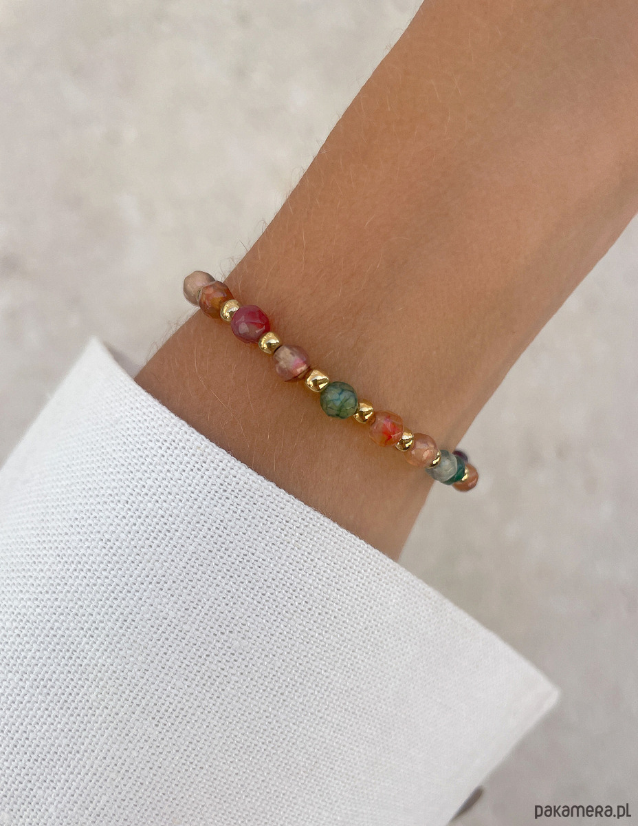 Bransoletka została wykonana z fasetowanych kuleczek agatu o średnicy około 4 mm. Ich powierzchnia zachwyca niepowtarzalnymi kolorami, co sprawia, że każdy kamień jest jedyny w swoim rodzaju. Wzór dopełniają lśniące, złote kuleczki z hematytu o średnicy około 3 mm, które nadają całości wyrafinowanego i nowoczesnego charakteru. Dzięki wykorzystaniu wytrzymałej, elastycznej żyłki jubilerskiej, bransoletka jest nie tylko piękna, ale także niezwykle komfortowa w noszeniu.
