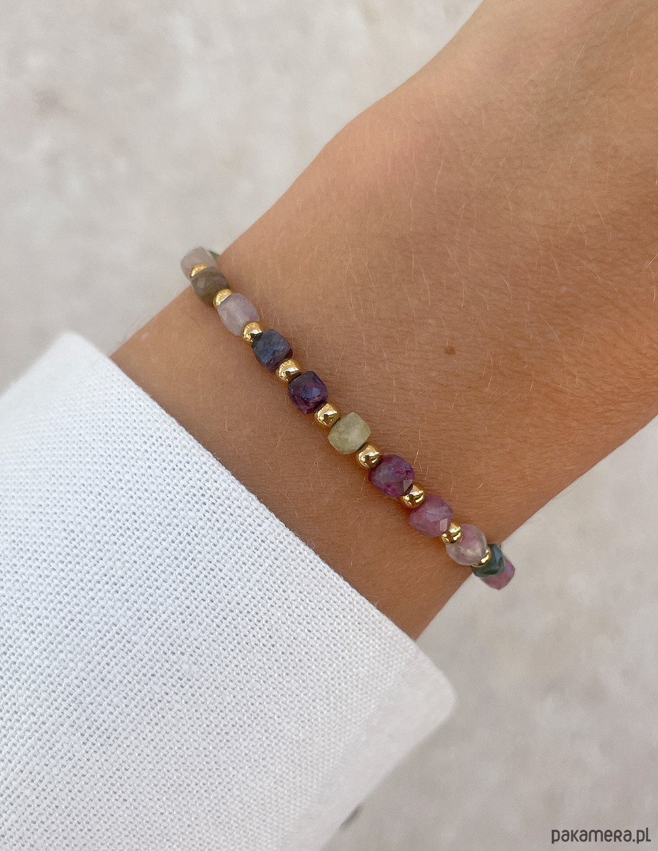 Bransoletka została wykonana z fasetowanych wielokolorowych kostek turmalinu o wymiarach około 4 mm. Ich powierzchnia zachwyca różnorodnością barw, co sprawia, że każdy kamień jest jedyny w swoim rodzaju. Wzór dopełniają lśniące, złote kuleczki z hematytu o średnicy około 3 mm, które nadają całości wyrafinowanego i nowoczesnego charakteru. Dzięki wykorzystaniu wytrzymałej, elastycznej żyłki jubilerskiej, bransoletka jest nie tylko piękna, ale także niezwykle komfortowa w noszeniu.