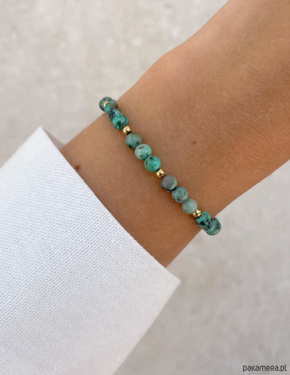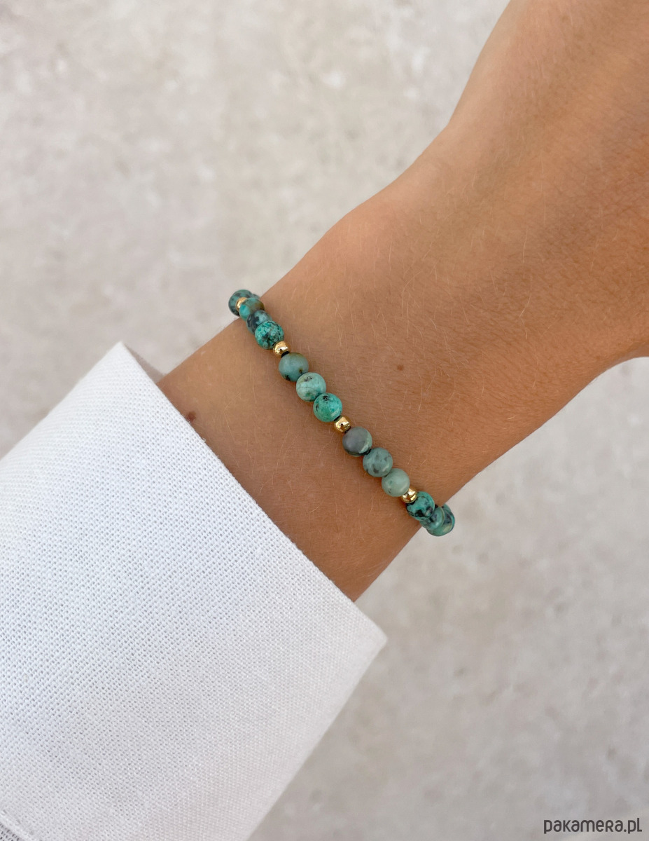 Bransoletka została wykonana z gładkich kuleczek turkusu afrykańskiego o średnicy około 4 mm. Ich powierzchnia zachwyca niepowtarzalnymi, turkusowymi odcieniami z licznymi wtrąceniami, co sprawia, że każdy kamień jest jedyny w swoim rodzaju. Wzór dopełniają lśniące, złote kuleczki z hematytu o średnicy około 3 mm, które nadają całości wyrafinowanego i nowoczesnego charakteru. Dzięki wykorzystaniu wytrzymałej, elastycznej żyłki jubilerskiej, bransoletka jest nie tylko piękna, ale także niezwykle komfortowa w noszeniu.