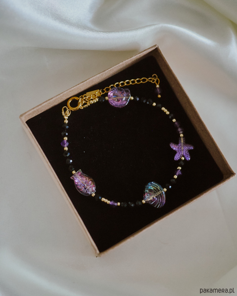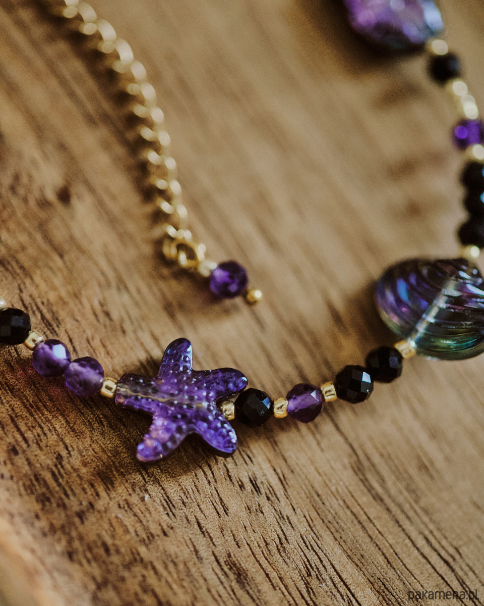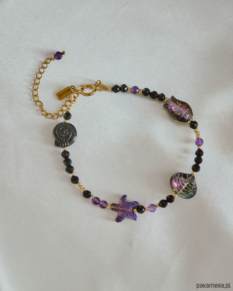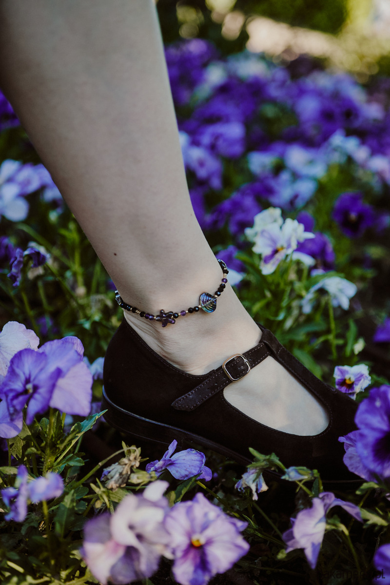 Bransoletka na kostkę z ametystu, onyksu i szklanych koralików.