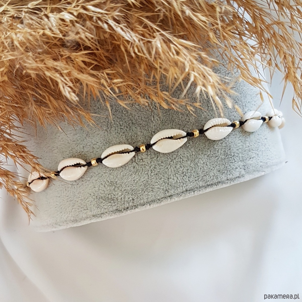 Bransoletka na kostkę na wytrzymałej nitce jubilerskiej z muszelek kauri w otoczeniu koralików ze szkła japońskiego w kolorze złotym. Regulowane zapięcie pozwala na dowolne dopasowanie do kostki.