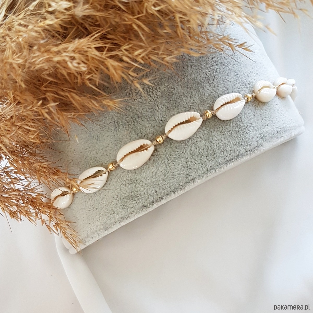 Bransoletka na kostkę na wytrzymałej nitce jubilerskiej z muszelek kauri w otoczeniu koralików ze szkła japońskiego w kolorze złotym. Regulowane zapięcie pozwala na dowolne dopasowanie do kostki.