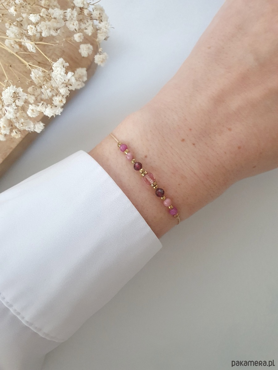 Ręcznie wykonana bransoletka–talizman na miłość z naturalnych kamieni: rubinu, granatu, kwarcu truskawkowego i rodonitu. Każdy kamień wspiera energię serca, wzmacnia uczucia i pomaga w budowaniu harmonijnych relacji. Kamienie nawleczone są na wytrzymałą nić jubilerską, a regulowane zapięcie na makramę umożliwia idealne dopasowanie do nadgarstka.