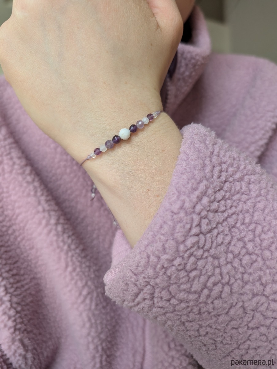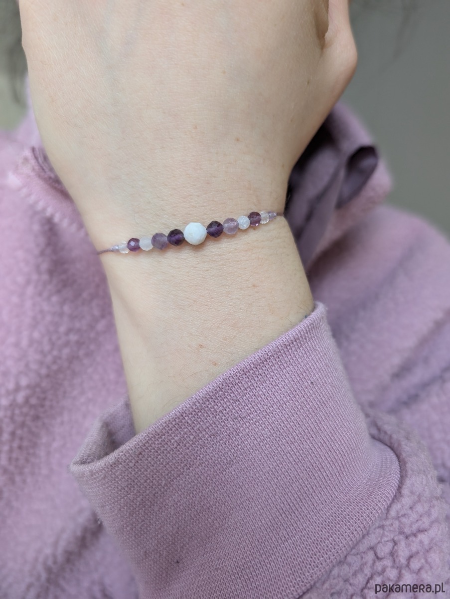 Delikatna bransoletka na nici w odcieniach fioletu i bieli. Połączenie różnej barwy ametystów i kamieni księżycowych. Tylko jedna sztuka, unikat.
