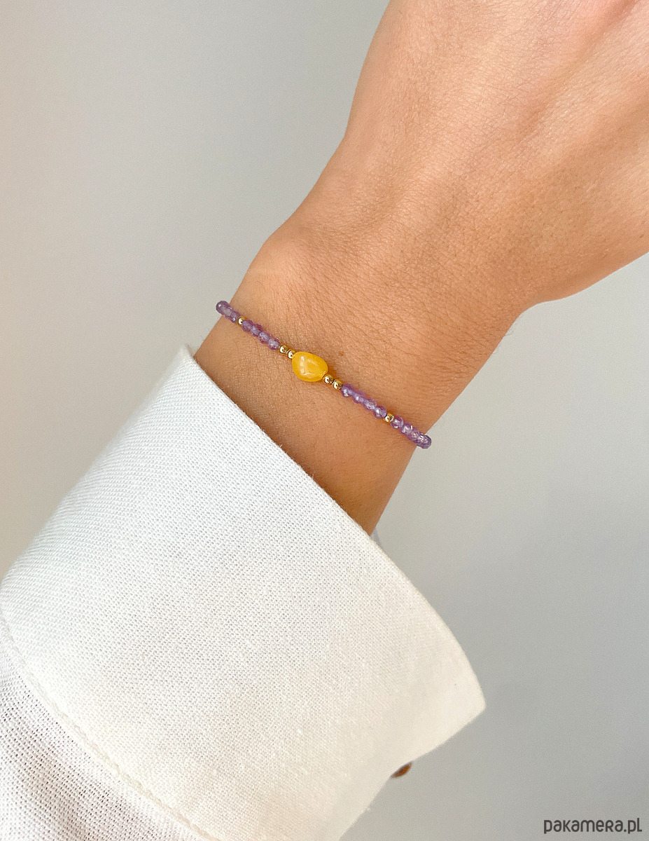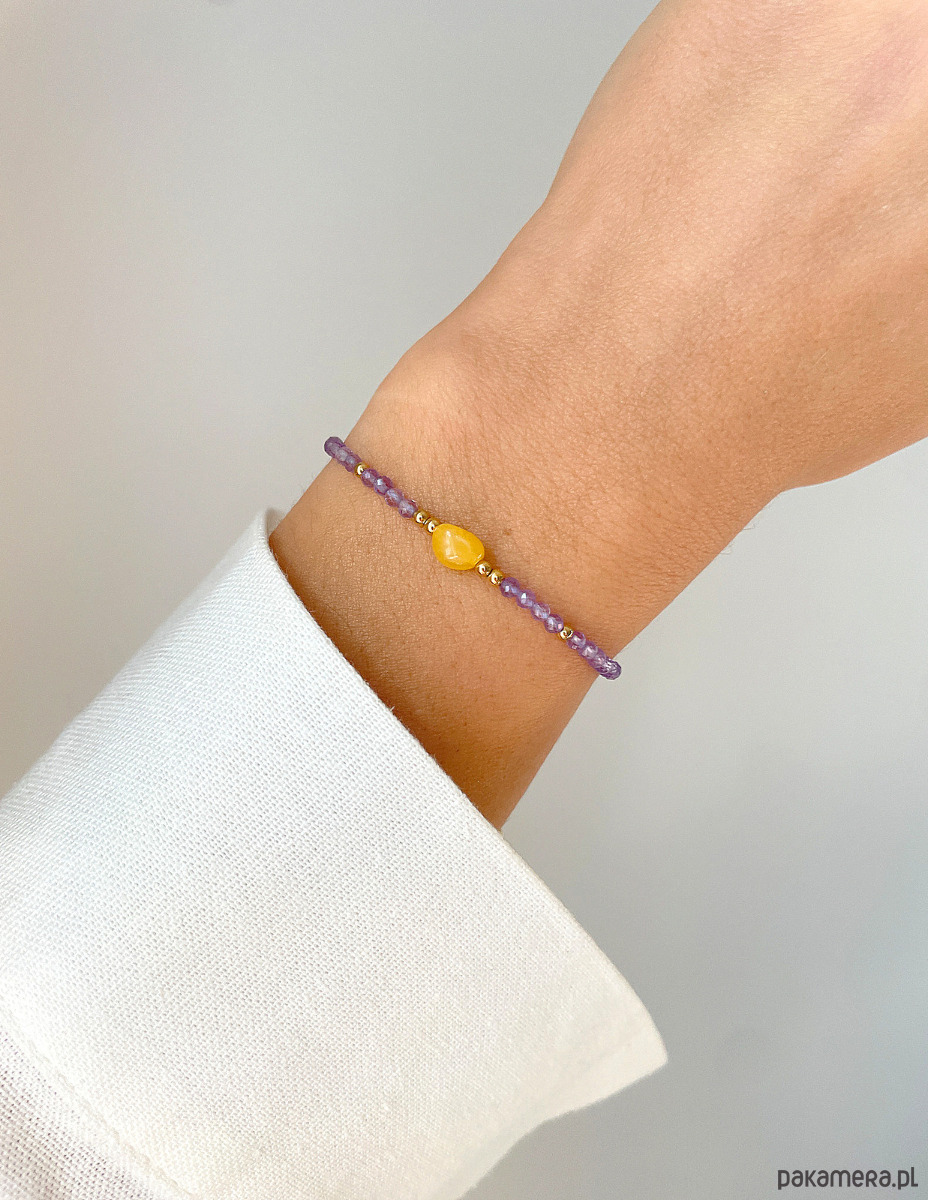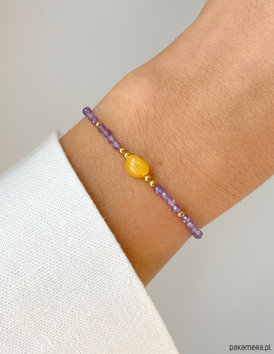 Ta bransoletka to spokojna i szlachetna kompozycja, idealna dla osób ceniących harmonię i naturalne piękno. Połączenie kojącego fioletu ametystu z ciepłym, mleczno-żółtym bursztynem w towarzystwie złota tworzy wyrafinowany i subtelny dodatek.