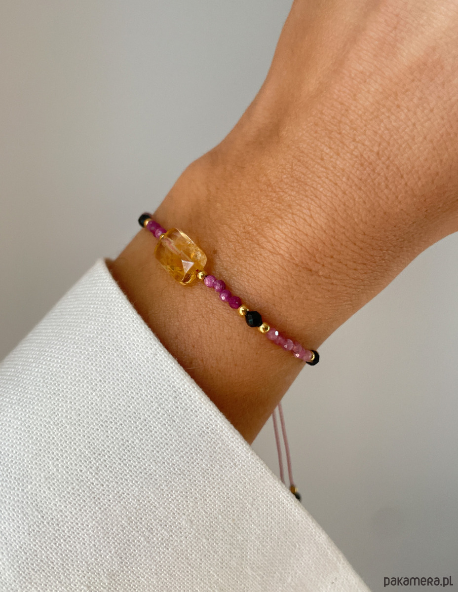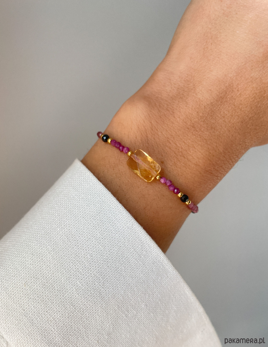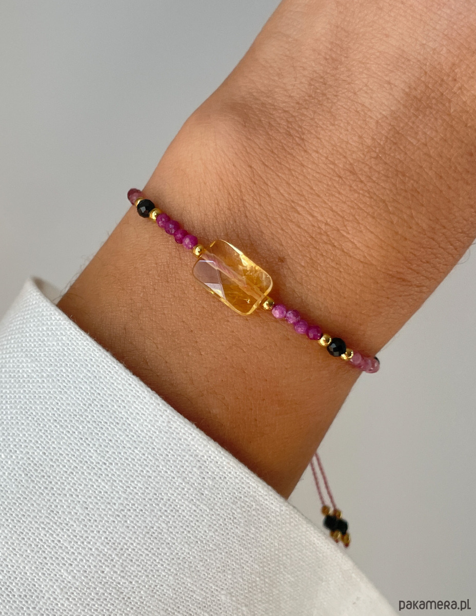 Ta bransoletka to potężny i wyjątkowo elegancki amulet, łączący w sobie energię ochronną i siłę dobrobytu. Kontrast czerni i głębokiego różu ze słonecznym Cytrynem, w towarzystwie lśniącego złota, tworzy dodatek pełen znaczenia.