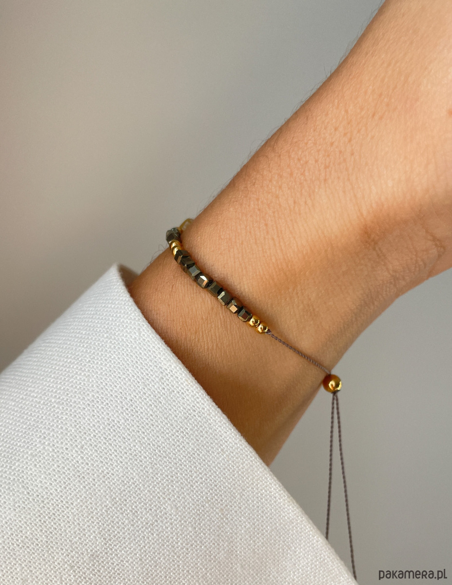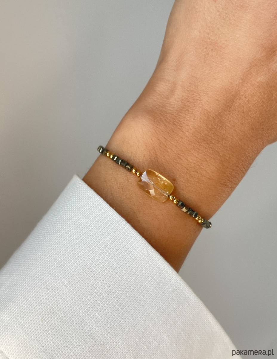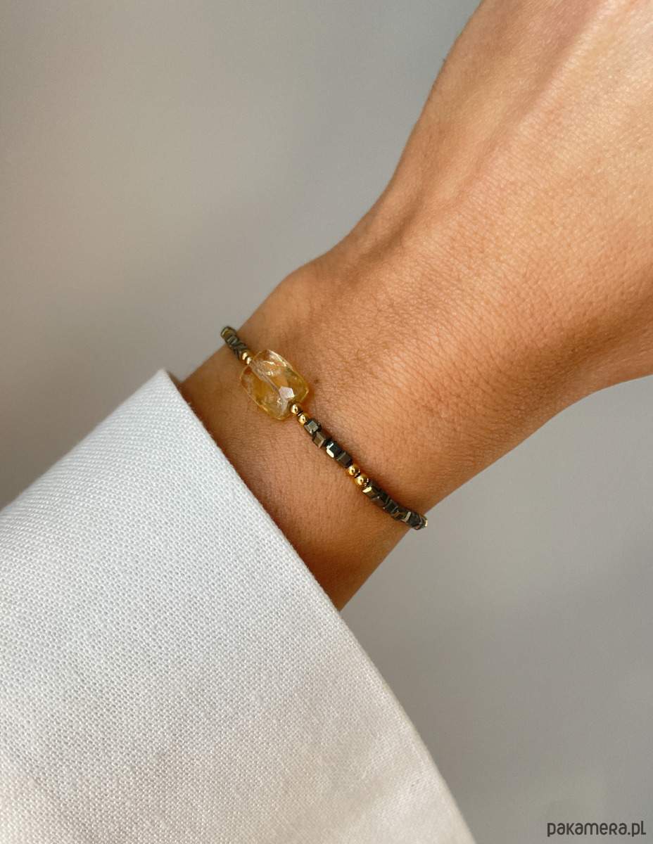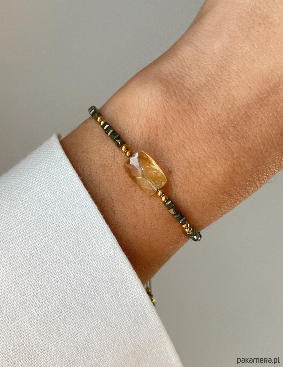 Bransoletka wykonana jest na wytrzymałej, nylonowej nici z wygodną regulacją długości (od 12 do 20 cm). Centralnym punktem jest fasetowana, prostokątna bryłka Cytrynu (ok. 7 x 12 mm) o słonecznym blasku. Całą kompozycję wzmacniają drobne, lśniące kosteczki Pirytu (ok. 2 mm), znanego jako złoto głupców, które idealnie komponują się ze złotymi kuleczkami Hematytu (ok. 2 mm), dodając biżuterii szlachetnego charakteru.