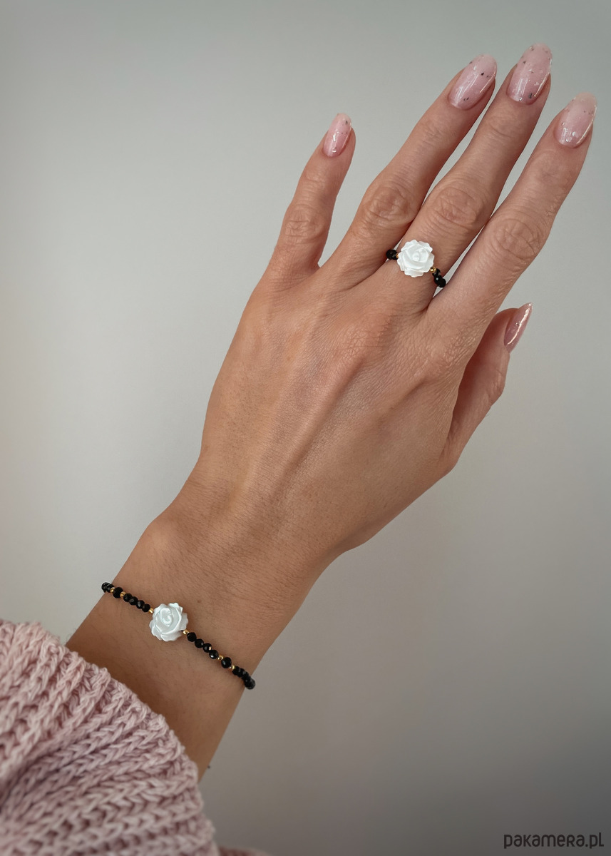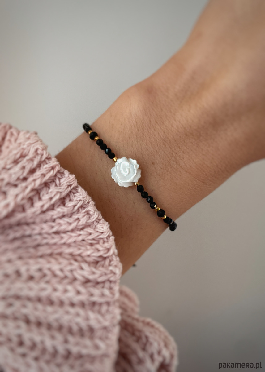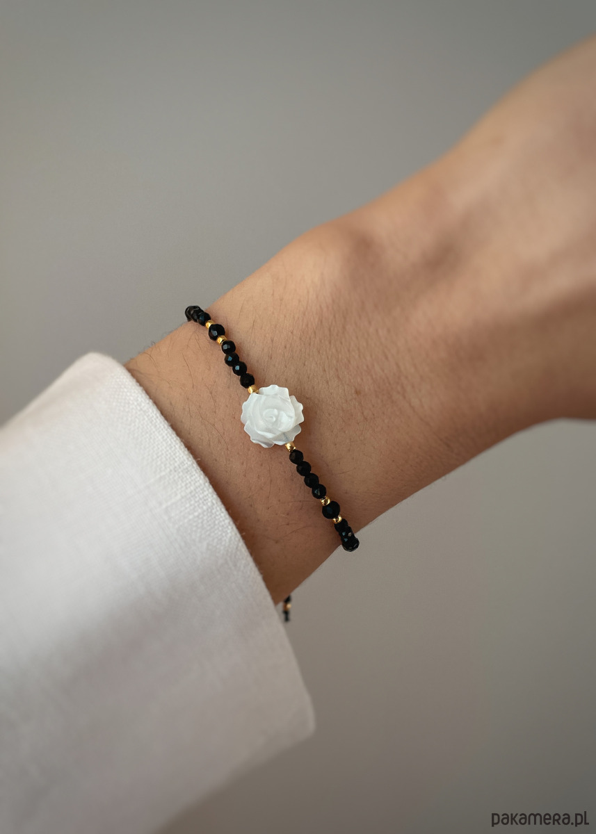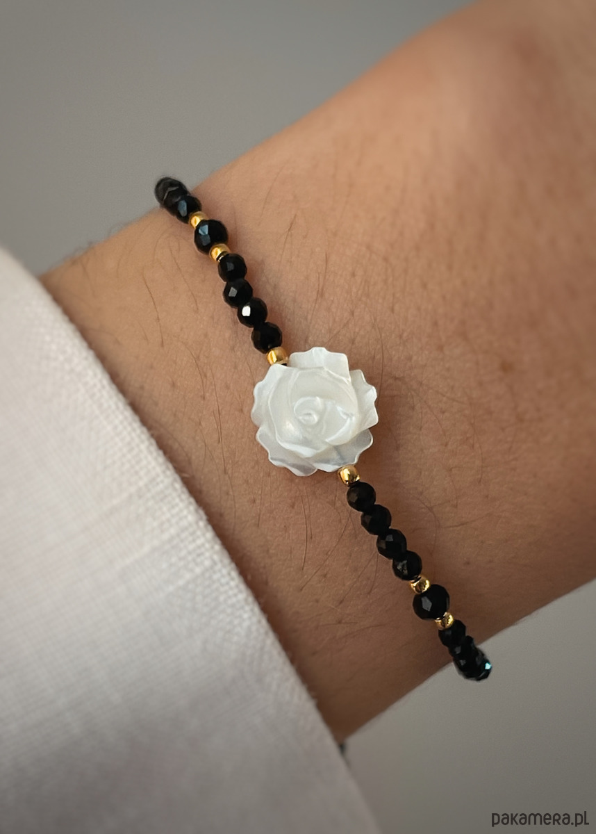Bransoletka z czarnego turmalinu oraz róży z masy perłowej z pozłacanymi kulkami ze srebra próby 925
