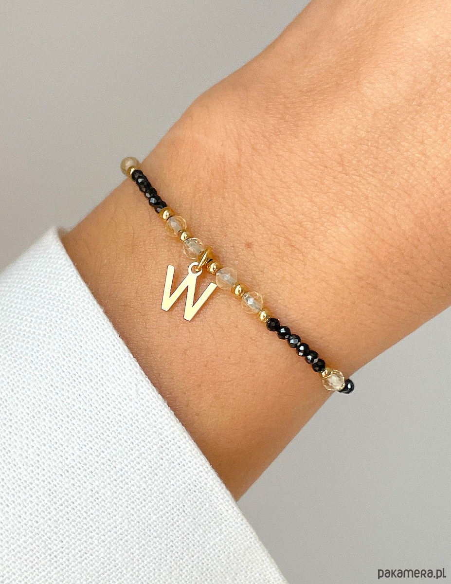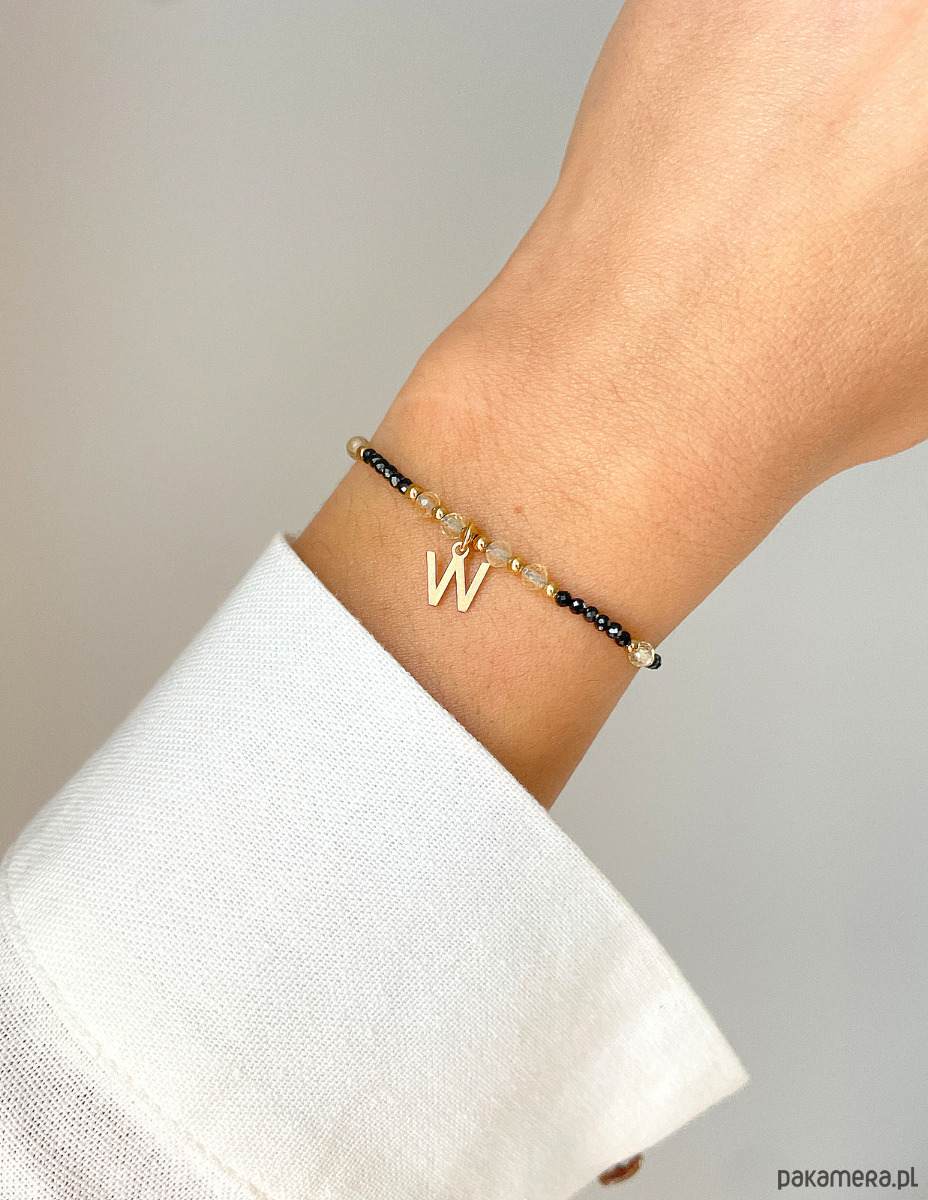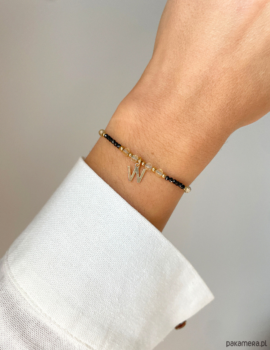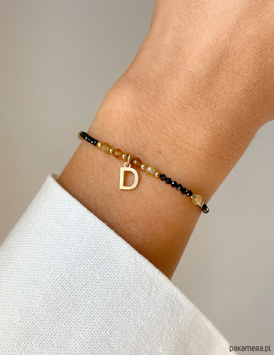 Bransoletka z czarnym turmalinem, cytrynem i hematytem w kolorze złotym, z literkąWielkość kamieni czarny turmalin: ok. 2mmWielkość kamieni cytryn: ok. 3 mm