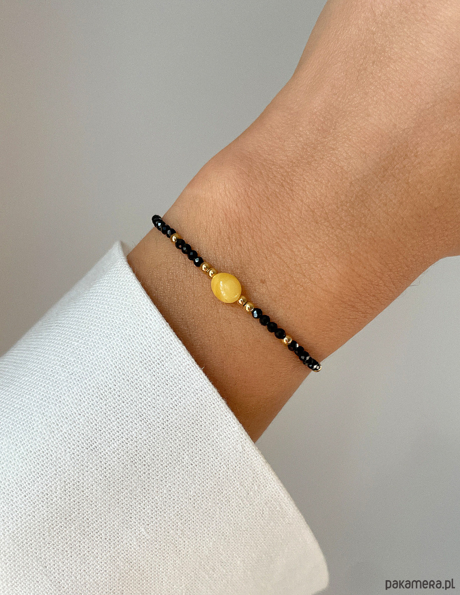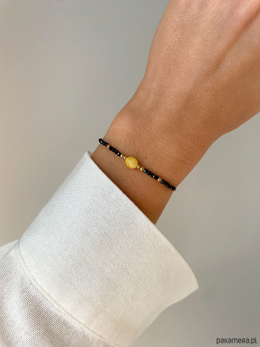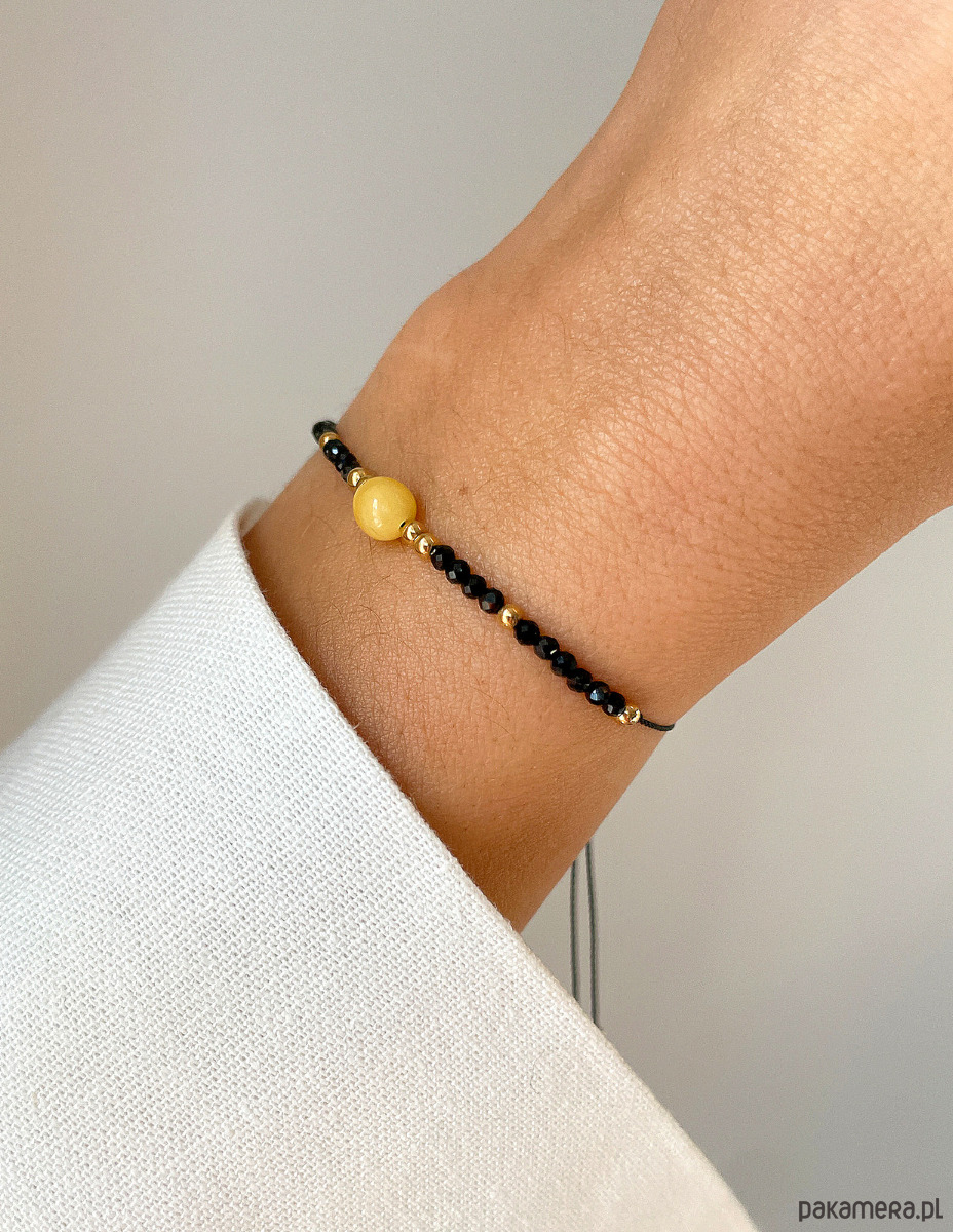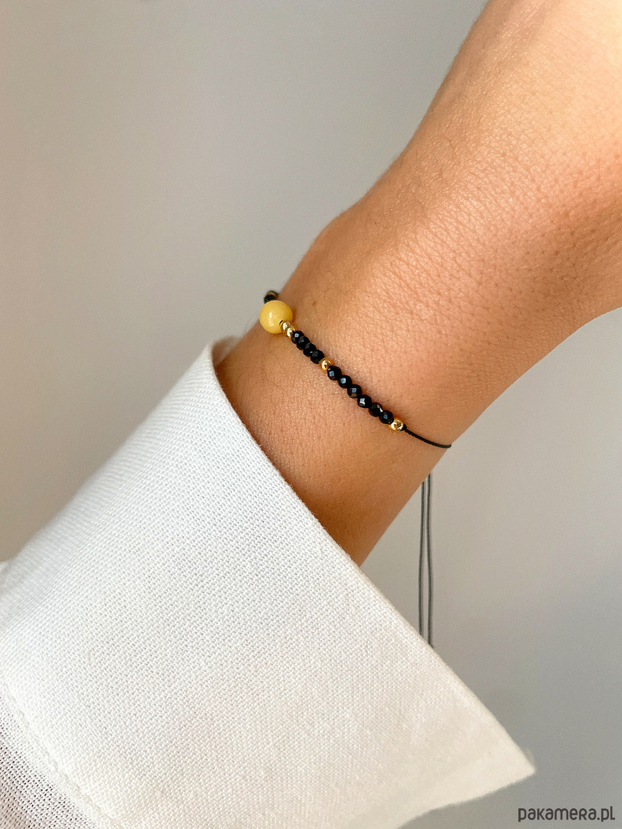 Bransoletka wykonana jest na wytrzymałej, nylonowej nici z wygodną regulacją długości (od 12 do 20 cm). Bazą są drobne kuleczki Czarnego Turmalinu (ok. 2 mm). Centralnym elementem kompozycji jest gładka bryłka Mlecznego Bursztynu (ok. 4 x 7 mm) w ciepłym, mleczno-żółtym odcieniu. Całości dopełniają błyszczące, złote kuleczki Hematytu (ok. 2 mm), które dodają biżuterii szlachetnego blasku. Połączenie czerni, żółci i złota tworzy elegancką i symboliczną paletę.