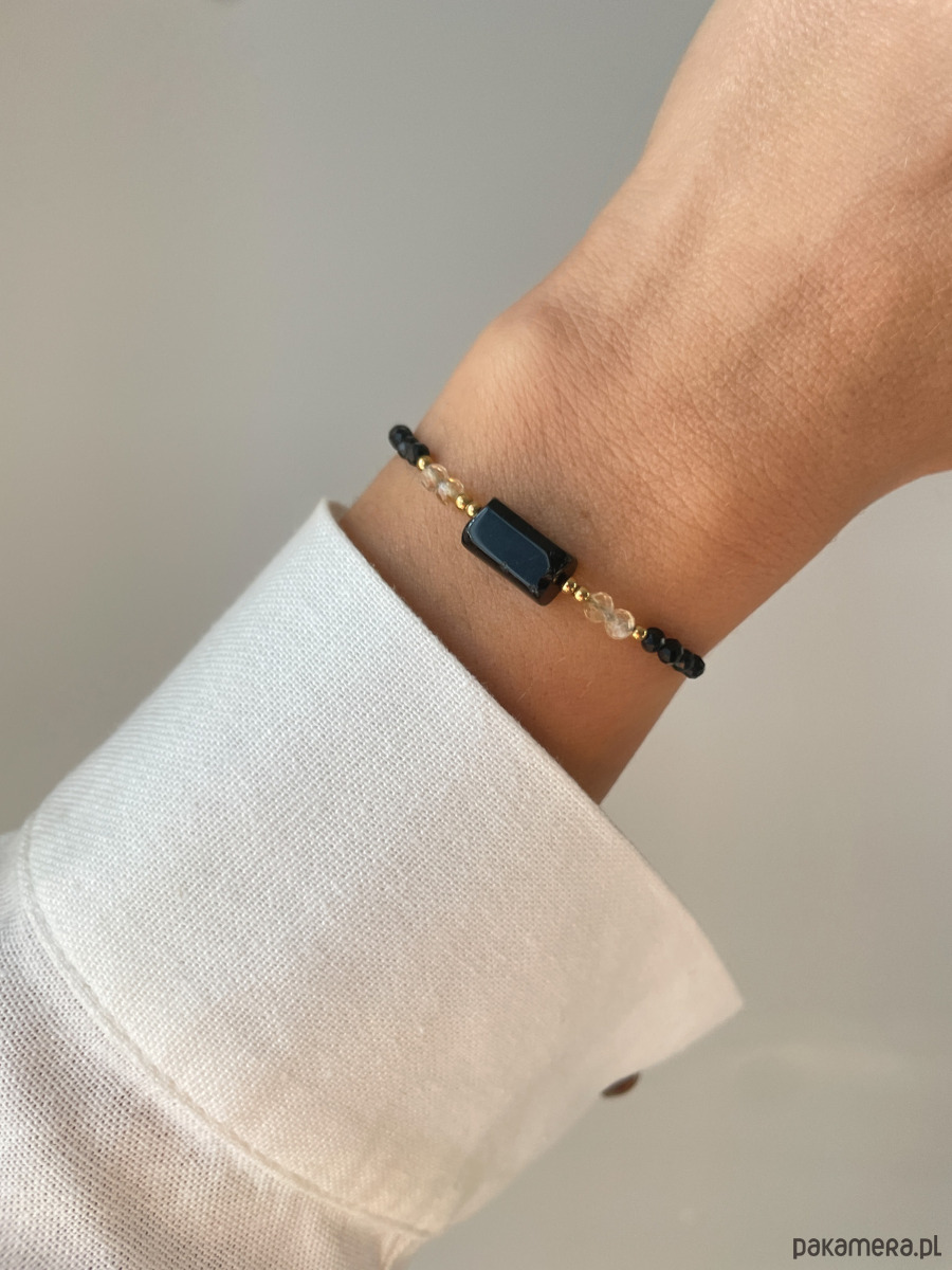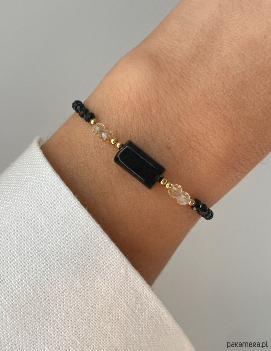 Ta bransoletka to mocne połączenie energii ochronnej z siłą przyciągającą bogactwo i radość. Centralnym punktem jest głęboka czerń turmalinu, której towarzyszy słoneczny żółty cytryn, a lśniące złoto dodaje całości wyrazistego charakteru.