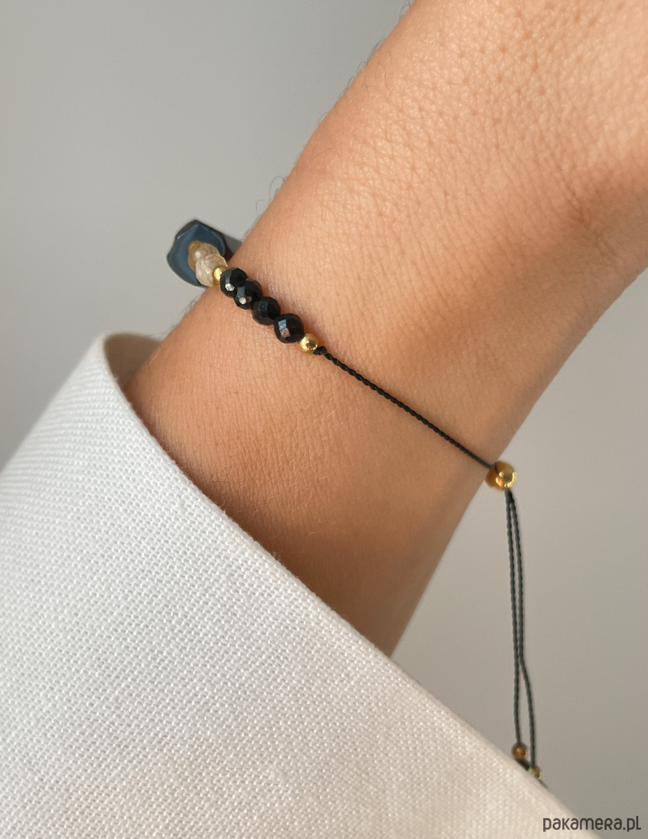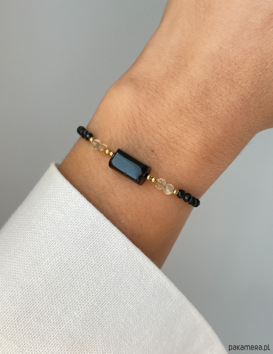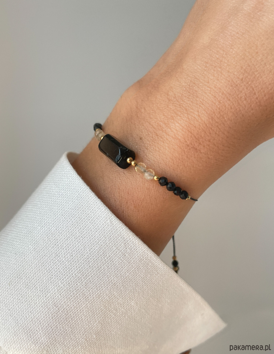 Bransoletka wykonana jest na wytrzymałej, nylonowej nici z wygodną regulacją długości (od 12 do 20 cm). Centralnym elementem jest gładka baryłka Czarnego Turmalinu (ok. 7 x 12 mm). Towarzyszą jej fasetowane kuleczki Czarnego Turmalinu i Cytrynu (ok. 4 mm), które wzmacniają kontrast i blask. Całości dopełniają błyszczące, złote kuleczki Hematytu (ok. 2 mm), które dodają biżuterii szlachetnego charakteru.
