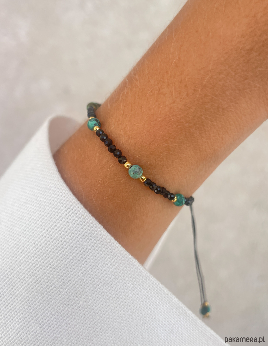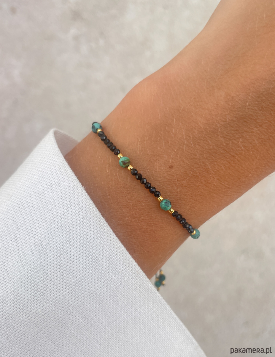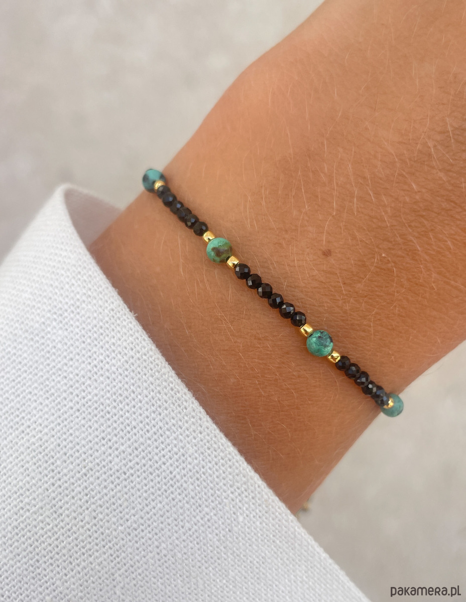 Bransoletka została starannie wykonana z drobnych, fasetowanych kulek czarnego turmalinu o wielkości ok. 2 mm, które przyciągają wzrok swoją głęboką czernią. Turmalin uważany jest za kamień ochronny, który ma pochłaniać negatywną energię. Uzupełniono go o radosne, zielone akcenty turkusu (ok. 3 mm), kamienia symbolizującego szczęście i spokój.