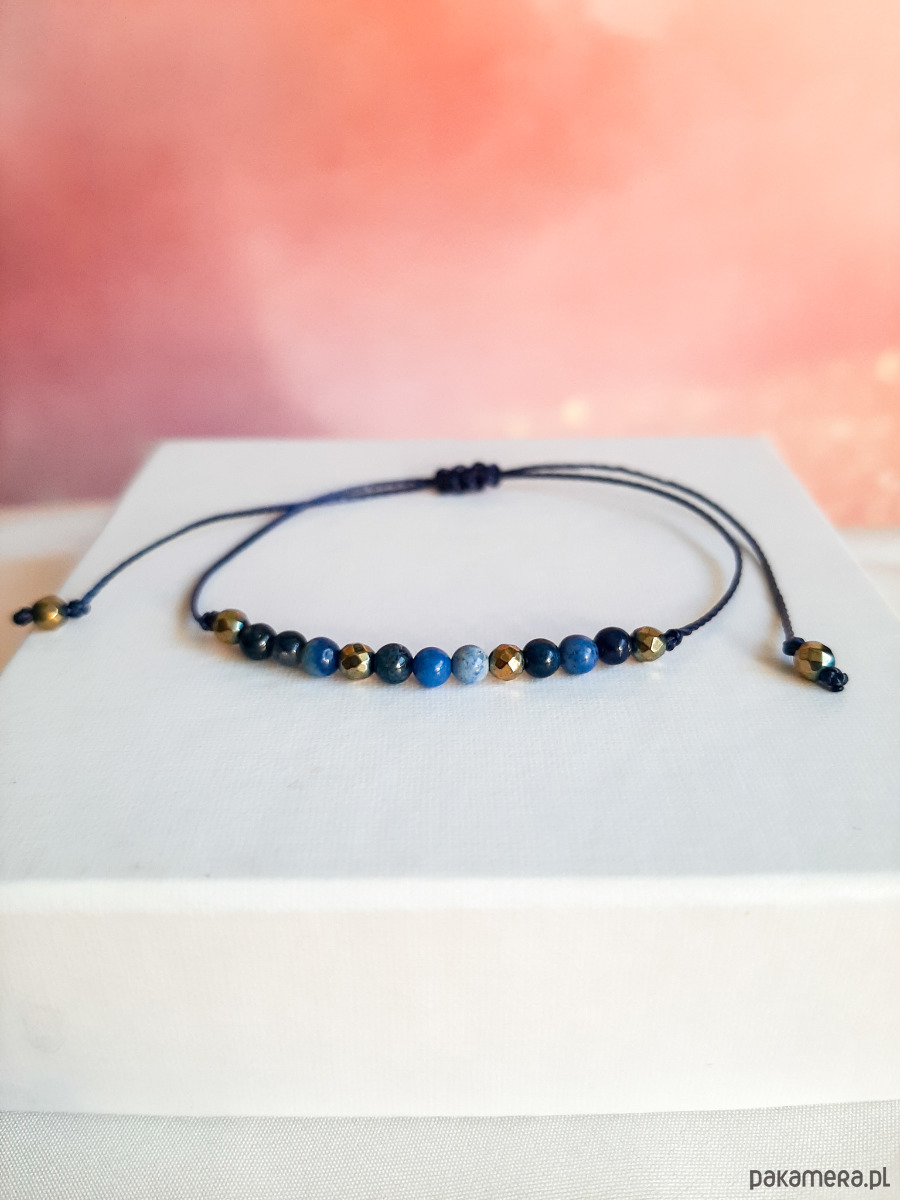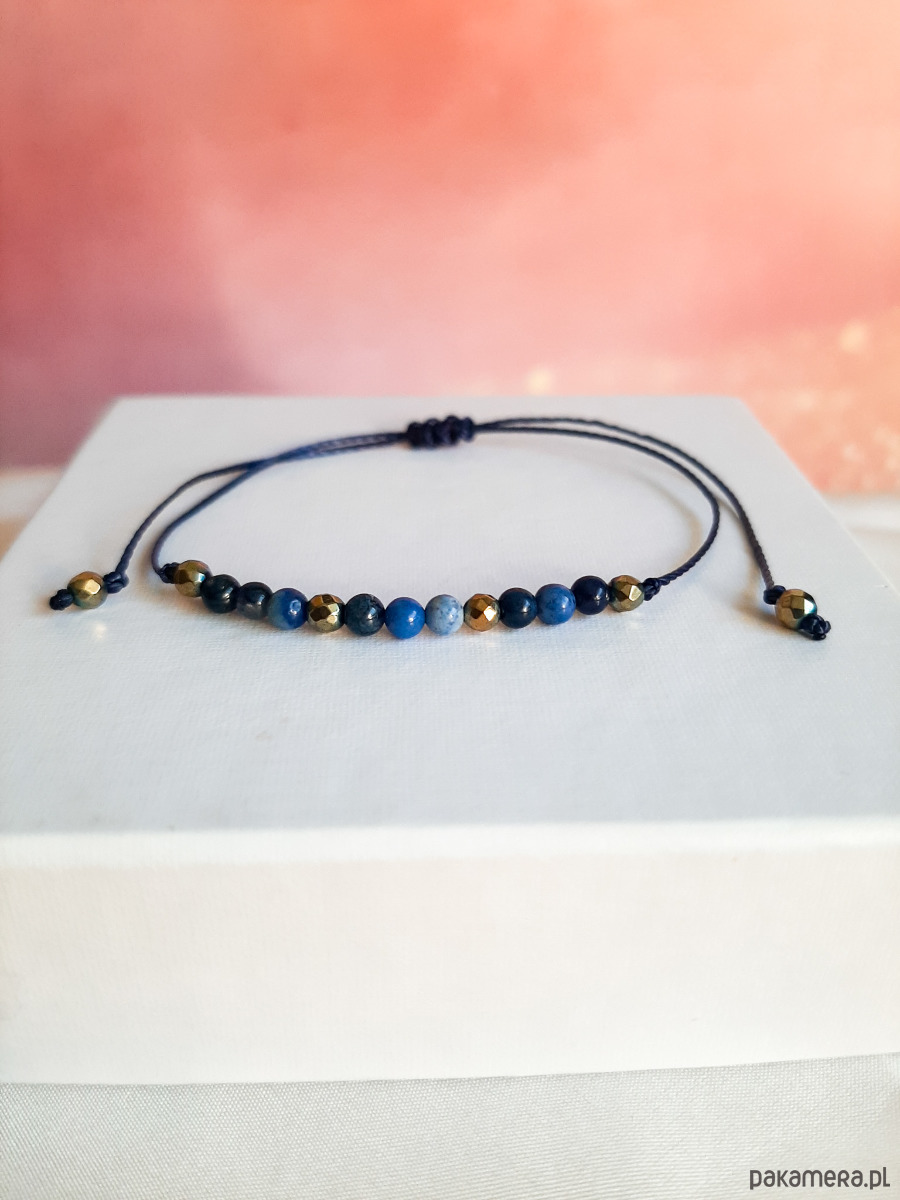 Bransoletka na nici w kolorze granatowym, regulowana. Ręcznie robiona bransoletka, zapakowana w estetyczny kartonik.