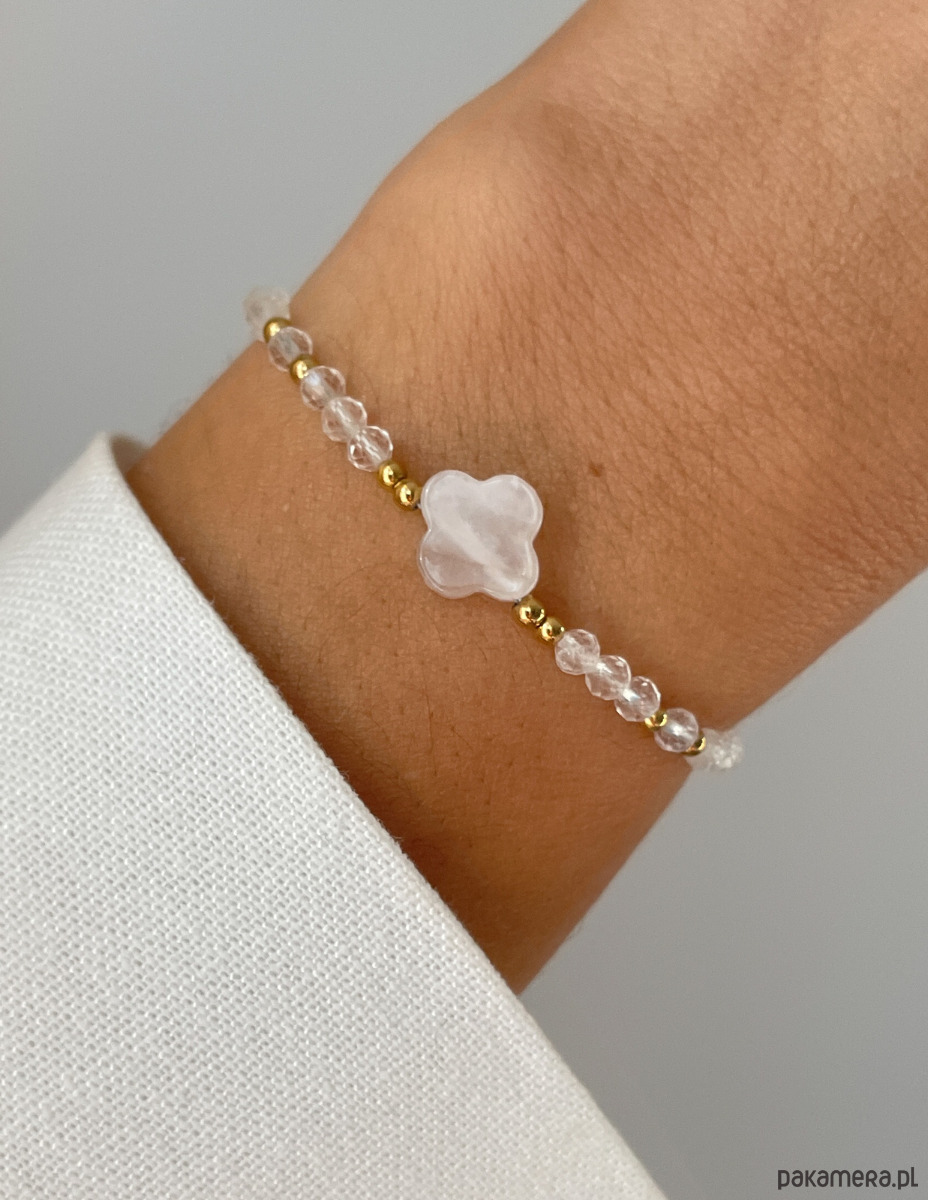 Bransoletka wykonana jest na wytrzymałej, nylonowej nici z wygodną regulacją długości (od 12 do 20 cm). Centralnym punktem jest gładka, symboliczna koniczyna z Kryształu Górskiego (ok. 10 mm). Towarzyszą jej drobne, fasetowane kuleczki Kryształu Górskiego (ok. 3 mm), które wzmacniają blask. Całości dopełniają błyszczące, złote kuleczki Hematytu (ok. 2 mm), które dodają biżuterii szlachetnego charakteru.