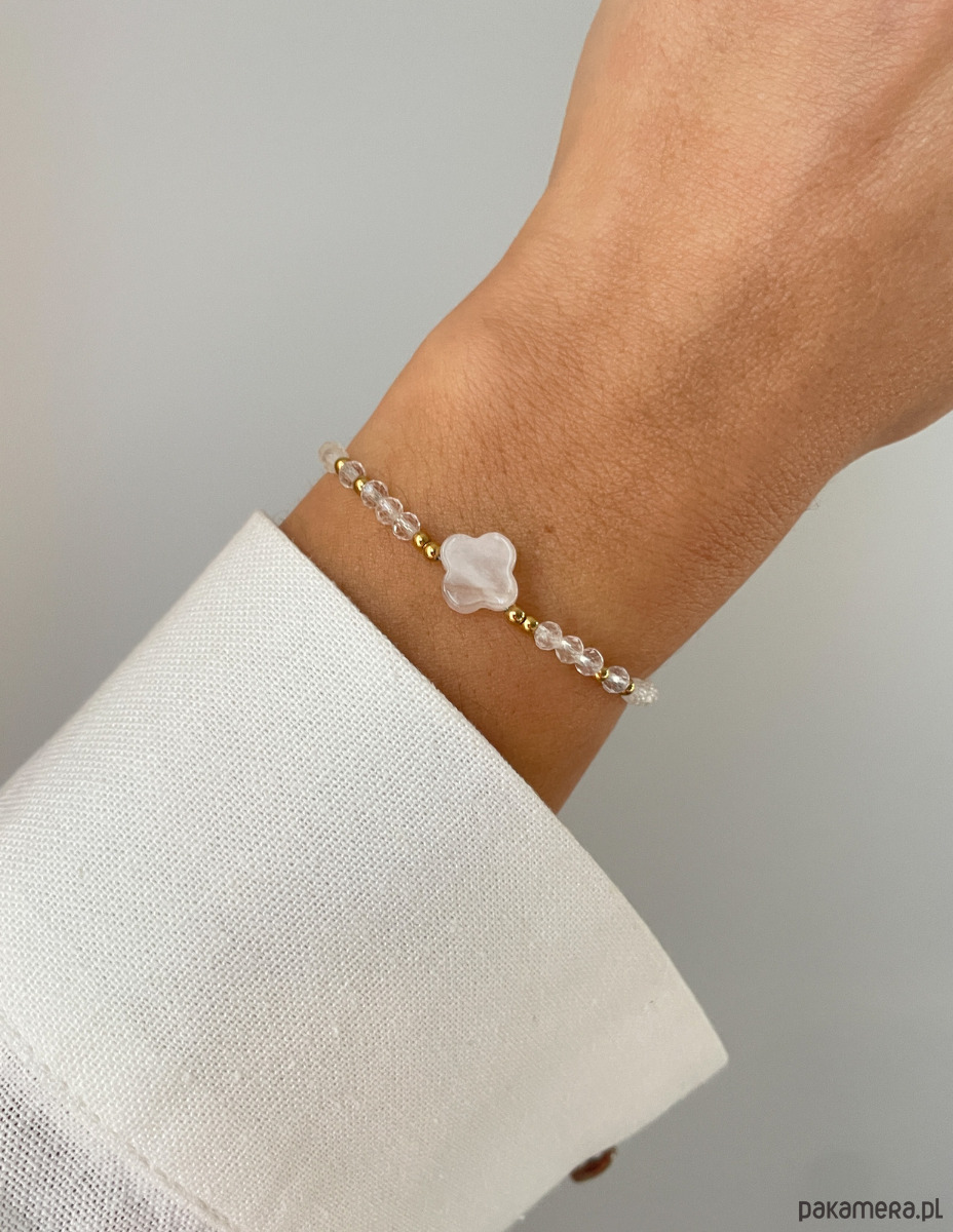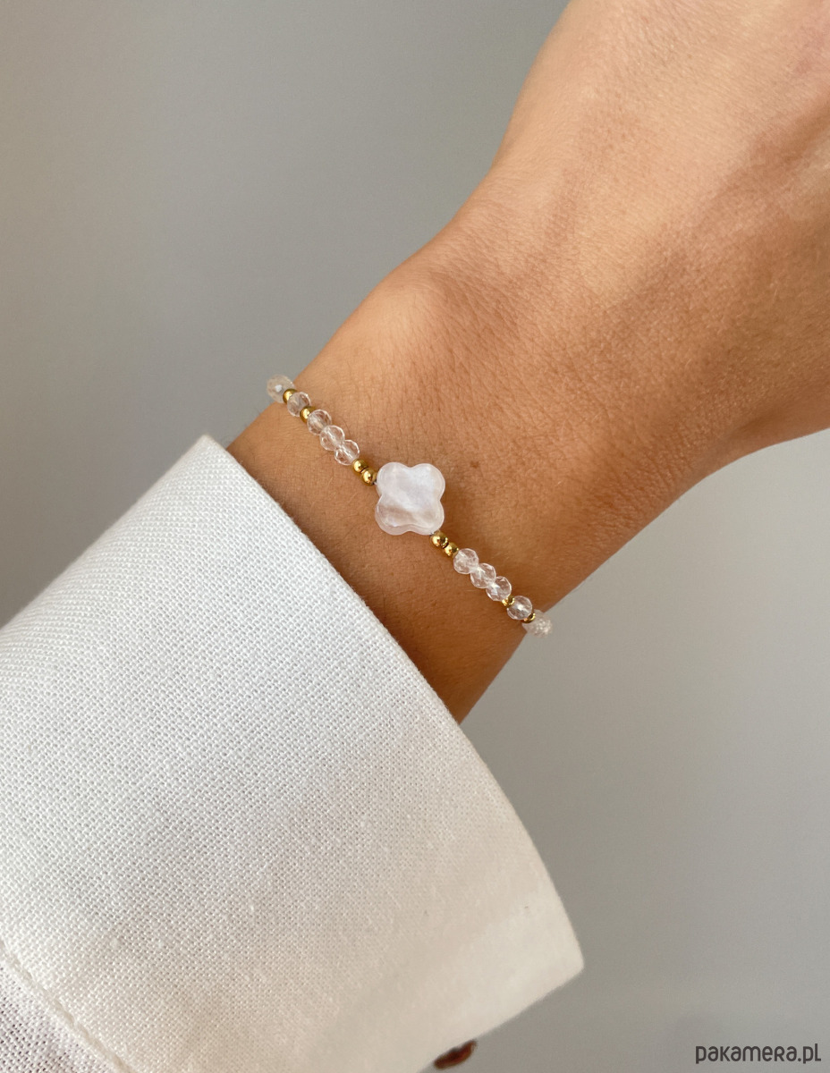 Ta bransoletka to delikatna i symboliczna kompozycja, łącząca czystą energię Kryształu Górskiego z motywem szczęścia i ochronną mocą Hematytu. Połączenie przejrzystości i złota sprawia, że jest to dodatek pełen blasku.