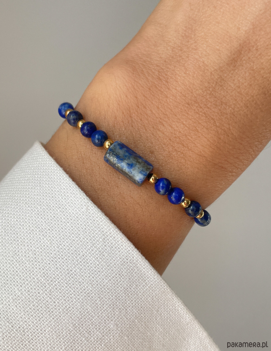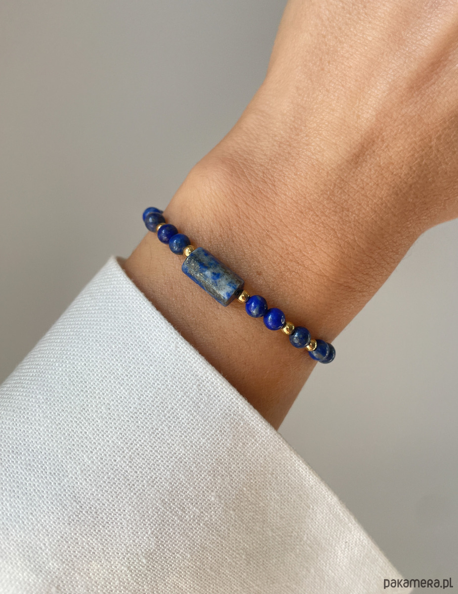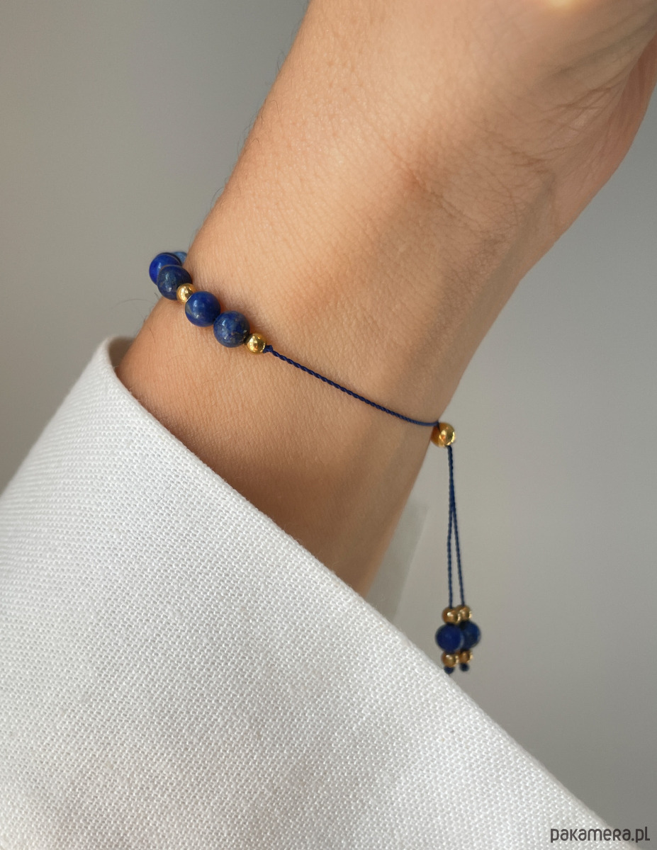 Bransoletka wykonana jest na wytrzymałej, nylonowej nici z wygodną regulacją długości (od 12 do 20 cm). Centralnym punktem jest gładka baryłka Lapis Lazuli (ok. 7 x 12 mm). Towarzyszą jej fasetowane kuleczki Lapis Lazuli (ok. 4 mm), które pięknie odbijają światło. Całości dopełniają błyszczące, złote kuleczki Hematytu (ok. 2 mm), które dodają biżuterii szlachetnego charakteru.