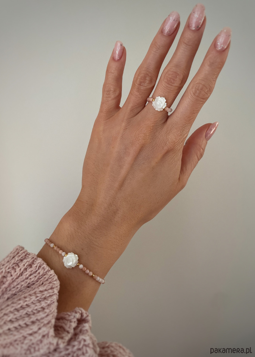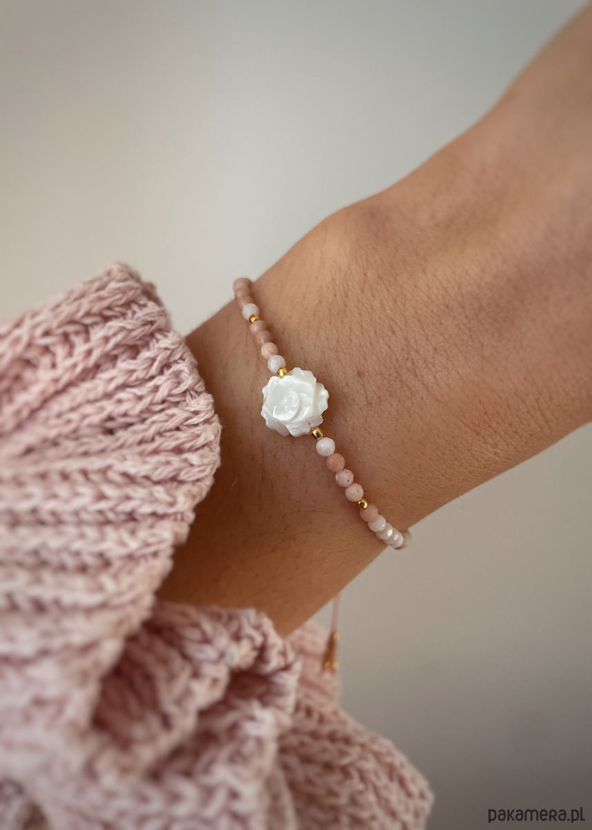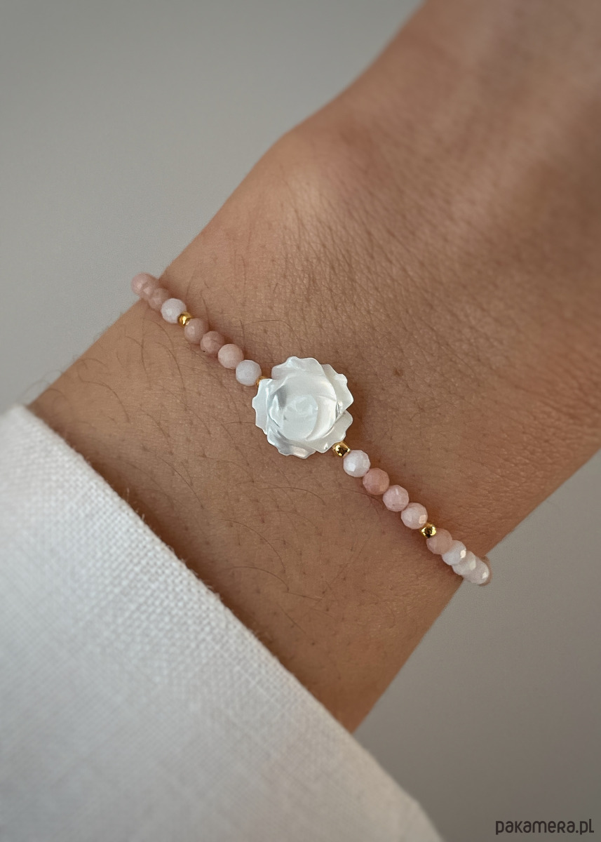Bransoletka z opalu oraz róży z masy perłowej z pozłacanymi kulkami ze srebra próby 925