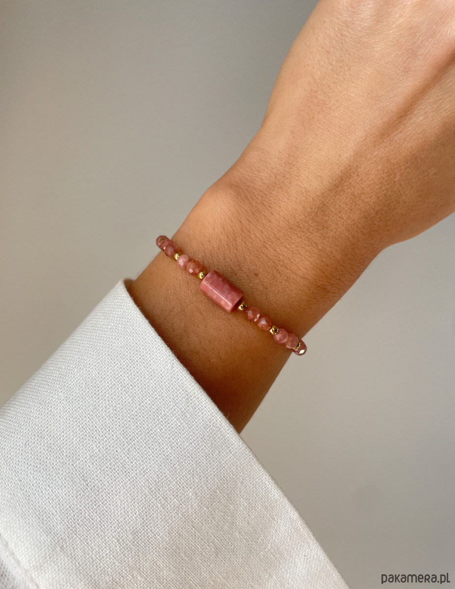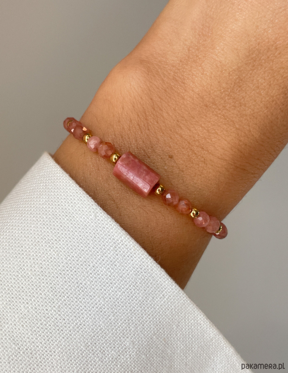 Ta bransoletka to delikatna i jednocześnie wyrazista kompozycja, symbolizująca miłość i wewnętrzną siłę. Piękny, żywy róż rodochrozytu z naturalnymi wzorami idealnie harmonizuje ze szlachetnym blaskiem złota.