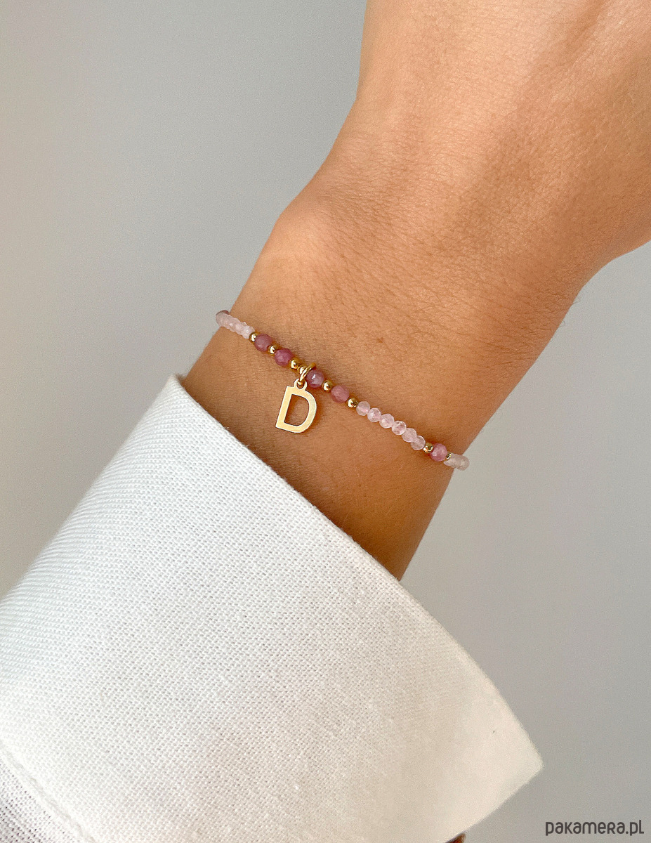 Ta bransoletka to idealne połączenie subtelnej energii i osobistego akcentu. Delikatny różowy turmalin i mistyczny kamień księżycowy tworzą harmonijne tło dla spersonalizowanej zawieszki-literki, a lśniące złoto nadaje całości szlachetnego charakteru.