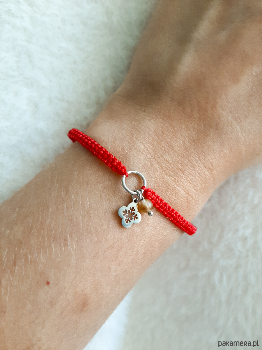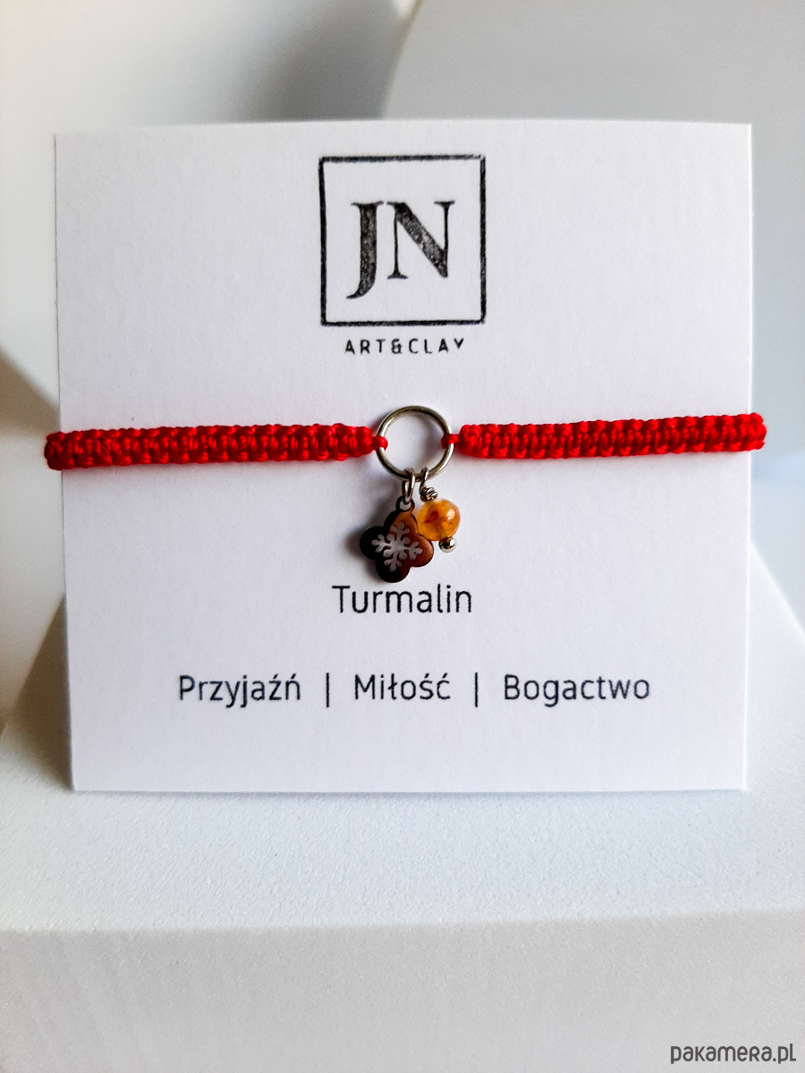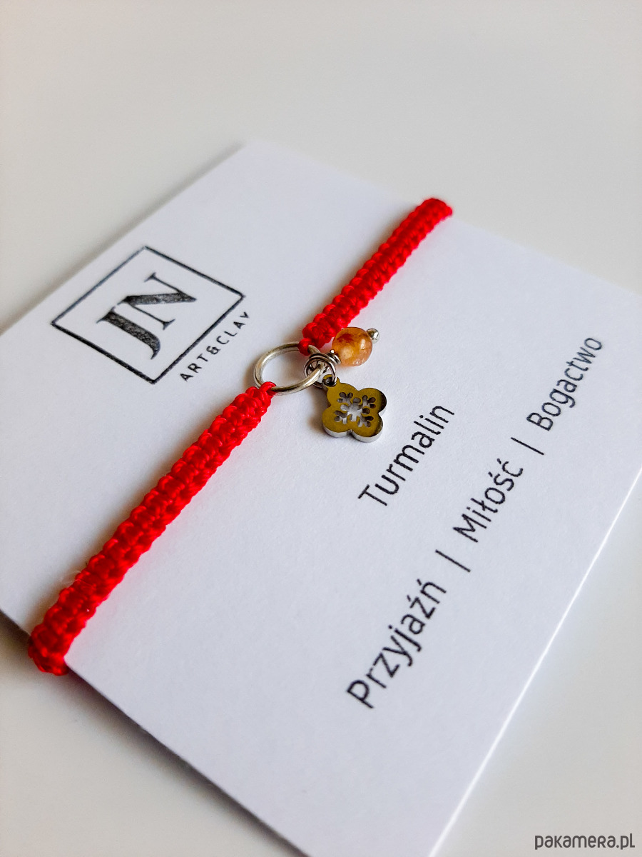 Bransoletka na wzmocnionej nici w kolorze czerwonym regulowana. Bransoletka posiada zawieszkę z turmalinem oraz zawieszkę ze stali chirurgicznej w kolorze srebrnym. Ręcznie robiona bransoletka, zapakowana w estetyczny kartonik. Idealna na prezent.