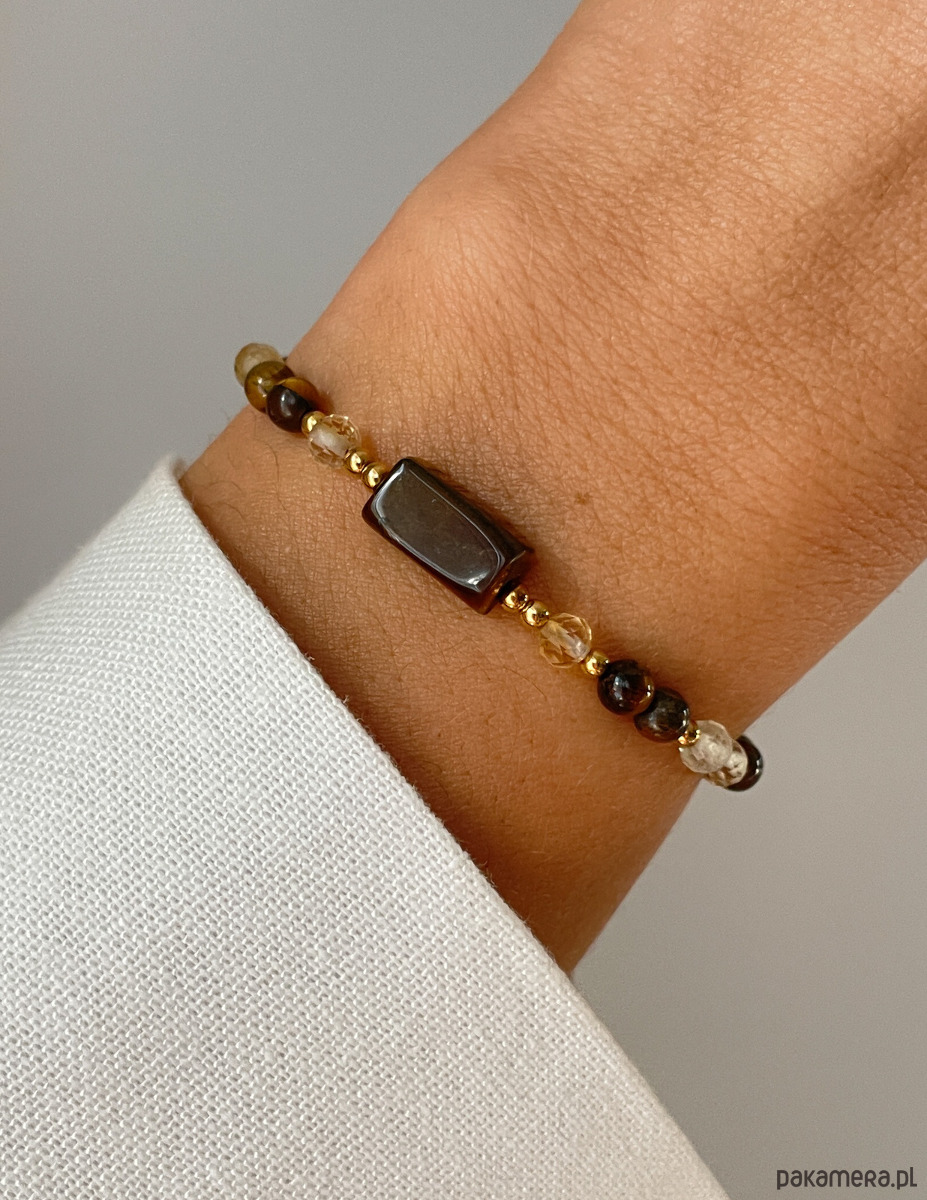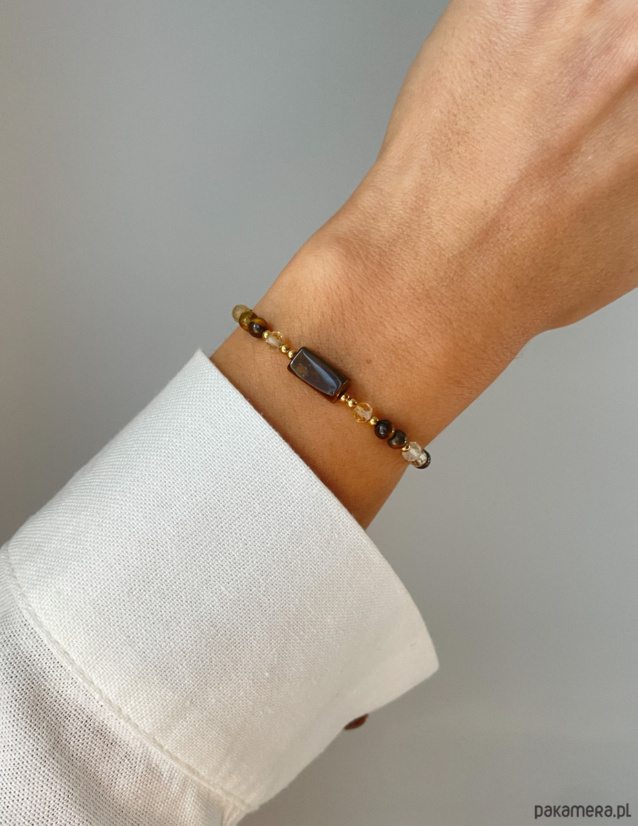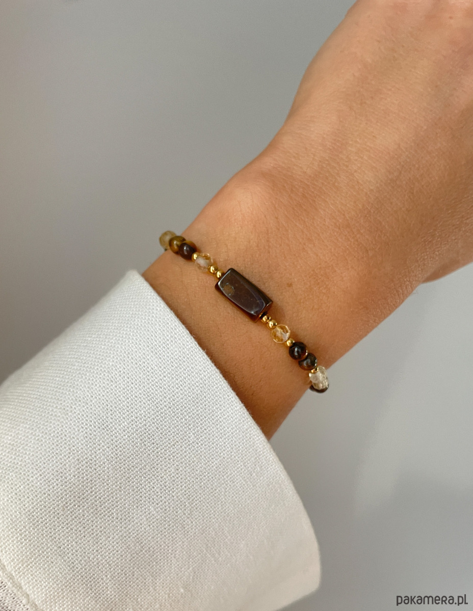 Ta bransoletka to energetyczny i stylowy amulet, łączący siłę woli i pewność siebie (Tygrysie Oko) z energią przyciągającą dobrobyt (Cytryn). Kontrast ziemistych brązów i słonecznego żółtego, w towarzystwie złota, tworzy wyjątkowy i wyrazisty dodatek.