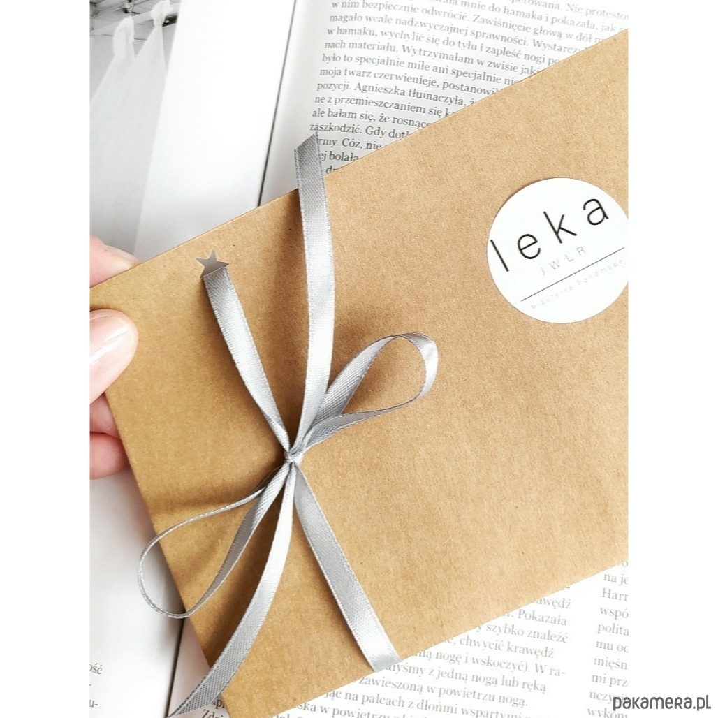 Biżuteria jest pakowana w kartonową etykietę oraz eko kopertę. Całość jest przepasana szarą lub różową wstążką, a uzupełnienie to naklejki i etykieta z logo. Nadaje się na prezent.