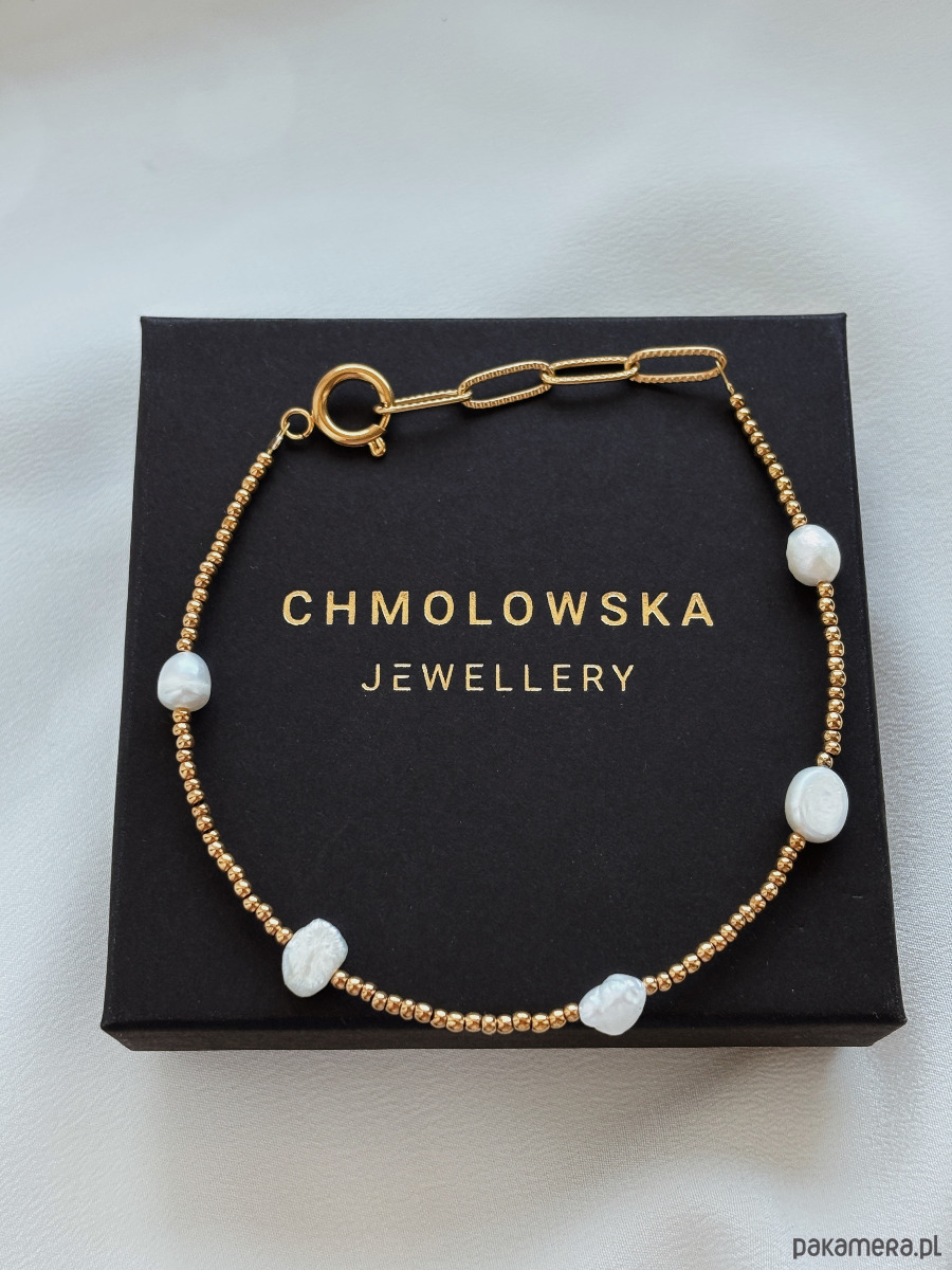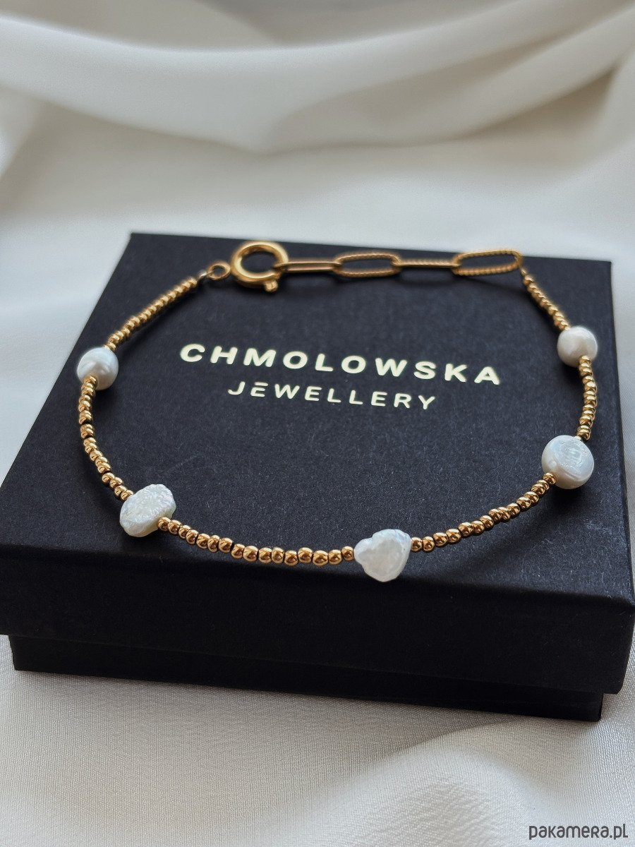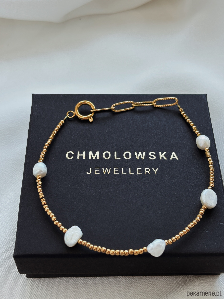 Bransoletka wykonana jest z na lince jubilerskiej z użyciem hematytów w kolorze złotym i pereł naturalnych, przedłużana łańcuszkiem i zapięciem.