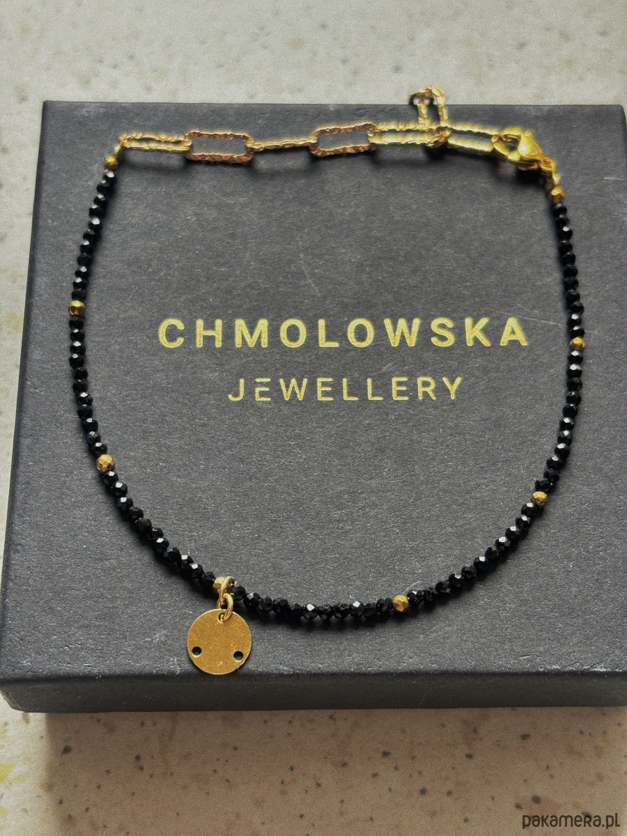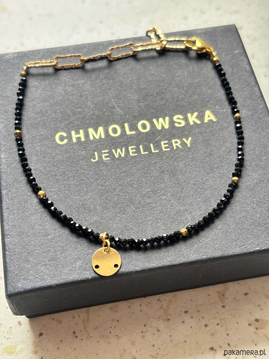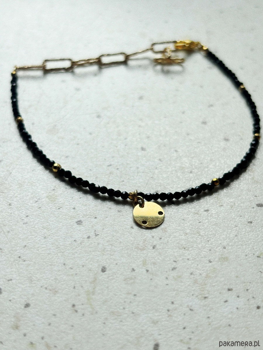 Bransoletka wykonana jest na lince jubilerskiej z użyciem onyksu, zapięcia i łańcuszka rodowanego złotem.