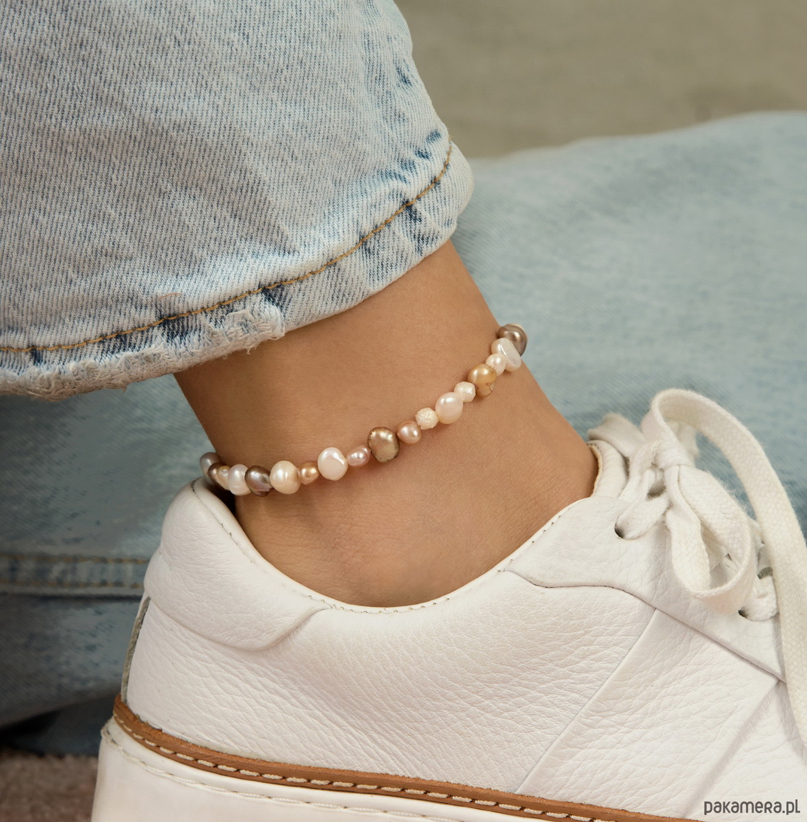 Bransoletka na nogę z pereł naturalnych (barokowych), słodkowodnych oraz srebra: