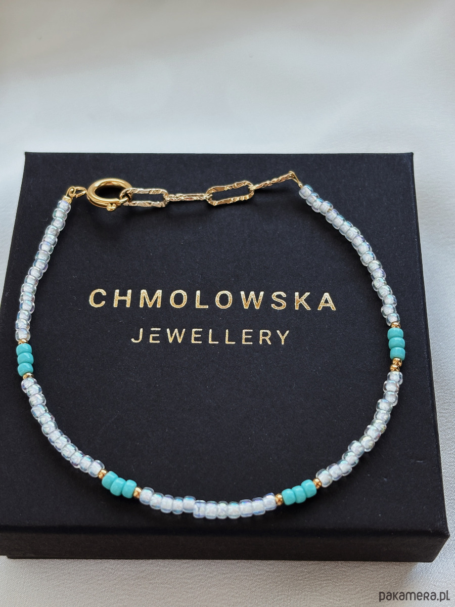 Bransoletka wykonana jest z na lince jubilerskiej z użyciem koralików toho, przedłużana łańcuszkiem i zapięciem.