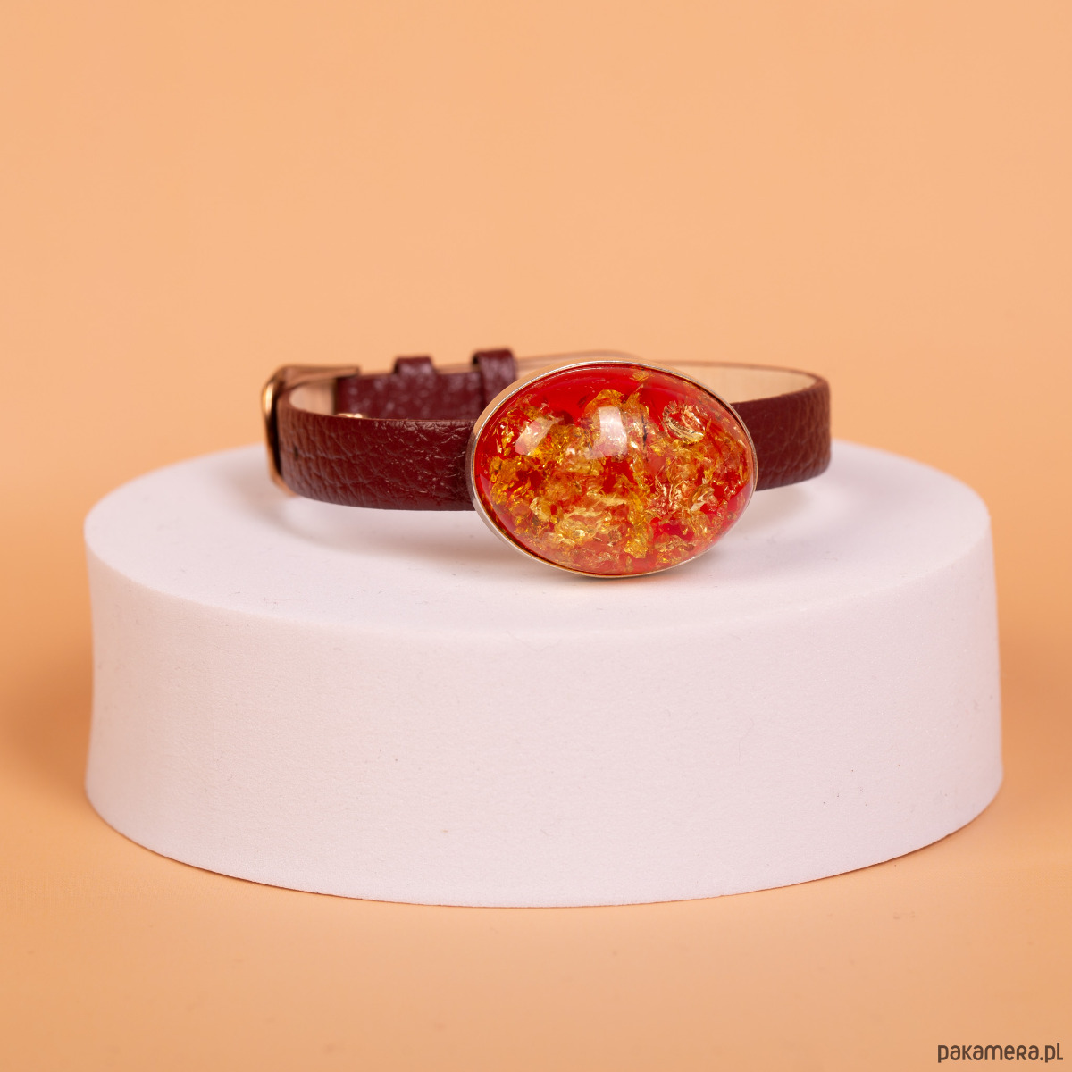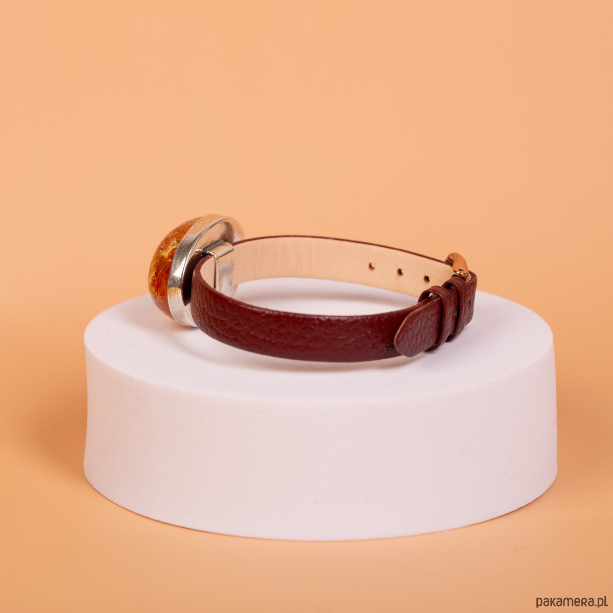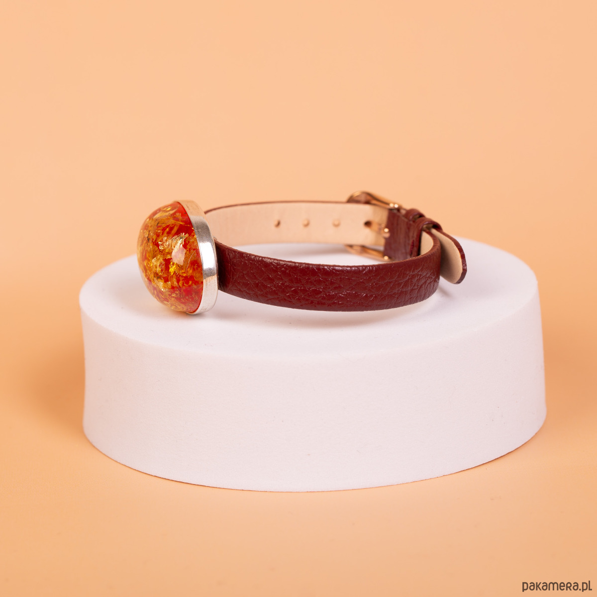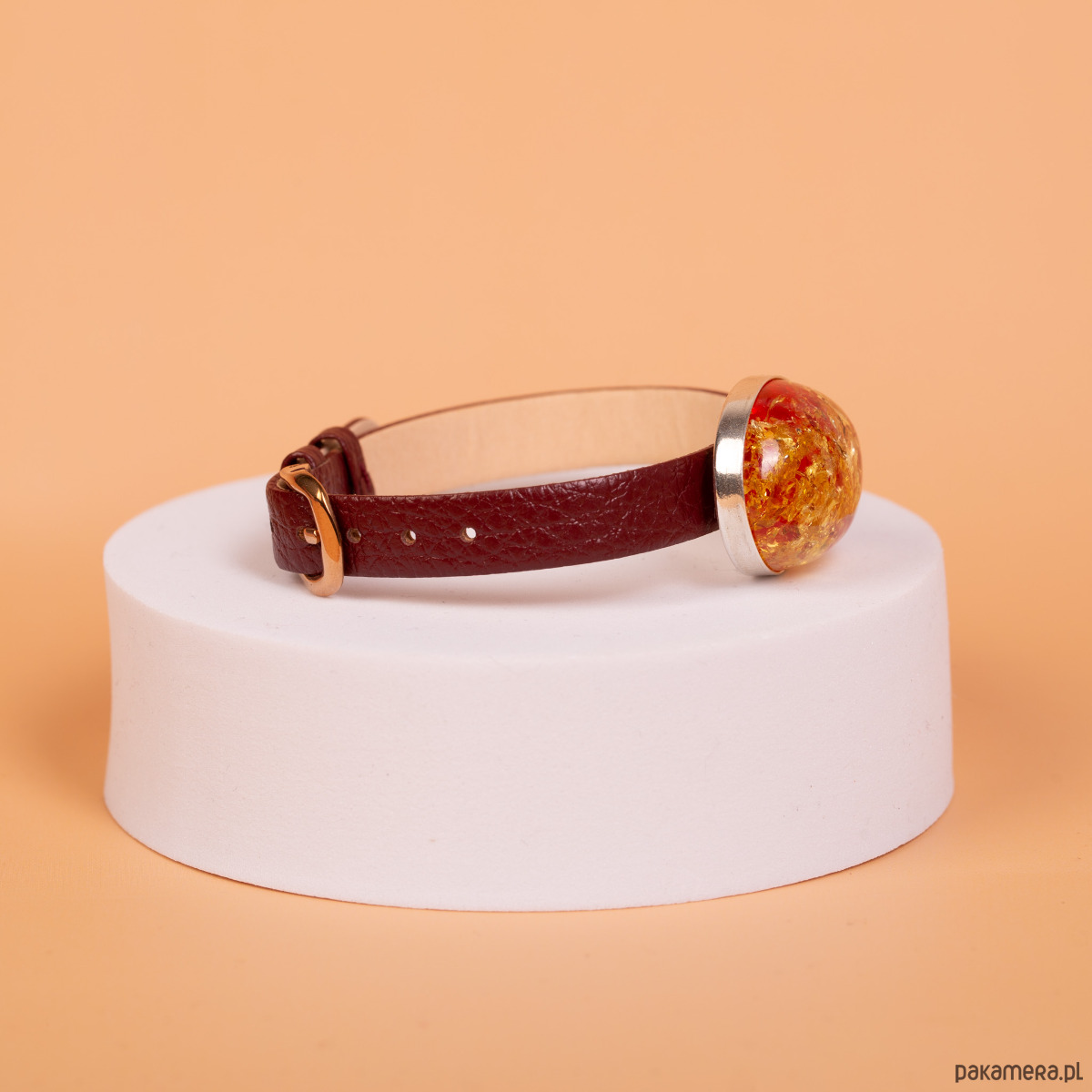 Srebro próby 925 · bursztyn bałtycki (barwiony) · element ozdobny 3 × 2,3 cm · wysokość 1,3 cm · waga elementu 9,4 g · pasek skórzany 23 cm × 1 cm · metalowe wykończenia w kolorze różowego złota · ręczna oprawa