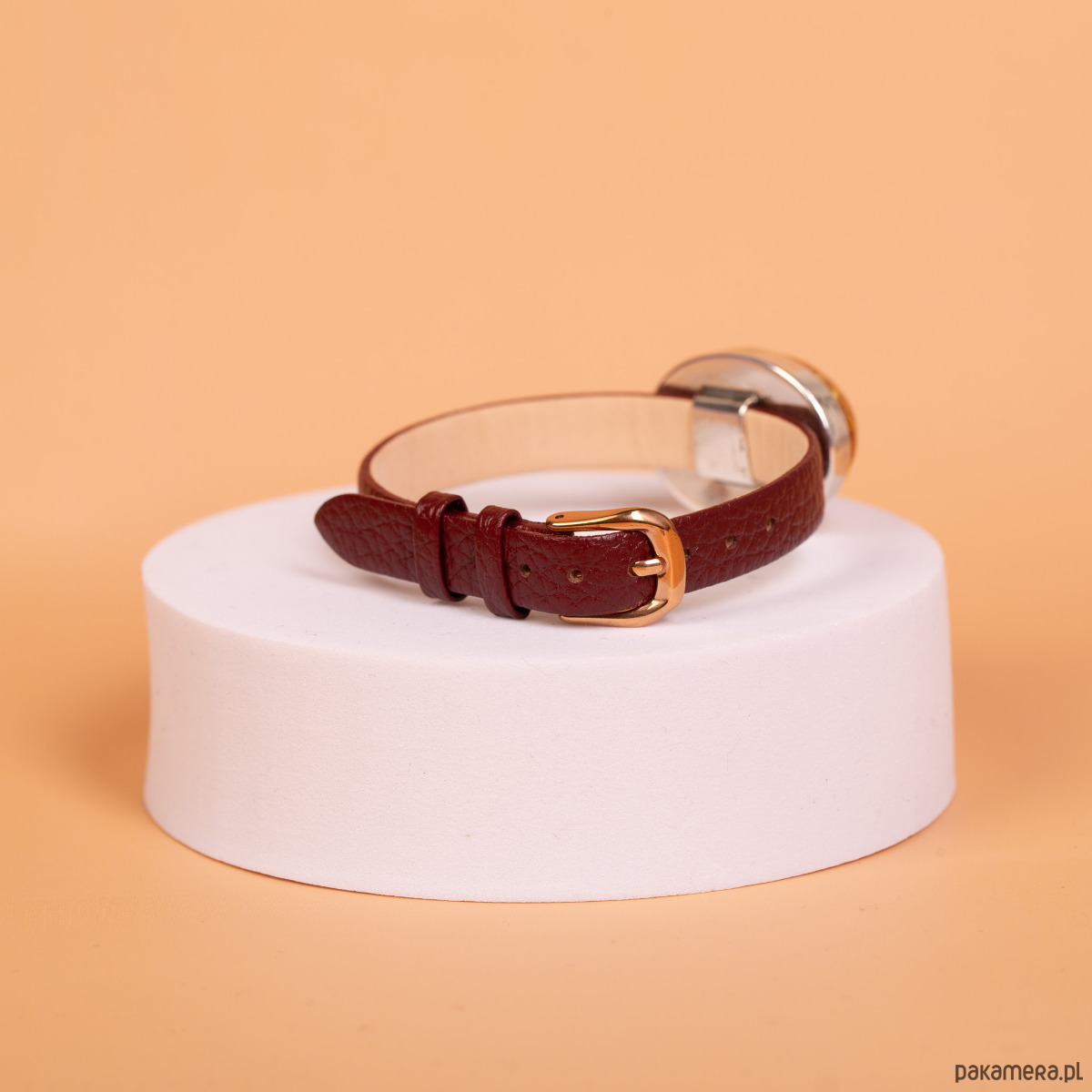 Forma i charakter: Bransoleta łączy nowoczesny minimalizm z efektownym akcentem kolorystycznym. Głęboki burgund paska pięknie kontrastuje z nasyconym odcieniem bursztynu, a metalowe elementy w kolorze różowego złota podkreślają elegancki styl całości. Dzięki klasycznej konstrukcji paska zegarkowego bransoletka łatwo dopasowuje się do nadgarstka i jest wygodna w codziennym noszeniu.