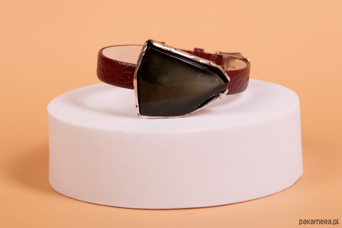 Oryginalna bransoleta łącząca surowy charakter burgundowej skóry z organicznym pięknem naturalnego bursztynu bałtyckiego. Centralnym punktem projektu jest okazała bryła bursztynu o rzadkim ciemnym odcieniu i zatopionej chmurze. Bursztyn został osadzony w ręcznie wykonanej oprawie z wysokiej próby srebra, która idealnie dopasowuje się do kształtu bursztynu, podkreślając jego unikatowy charakter.