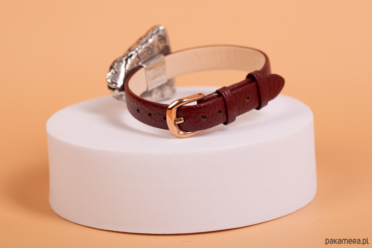 Forma i charakter: Bransoleta wyróżnia się nowoczesną formą inspirowaną klasycznym paskiem zegarkowym. Połączenie fakturowanej skóry z gładkim, lśniącym bursztynem tworzy intrygujący kontrast faktur. Srebrna oprawa, wykonana w całości ręcznie, stanowi solidną i elegancką ramę dla bursztynu, nadając całości artystycznego sznytu. Dzięki zapięciu na klamerkę, biżuteria oferuje szeroki zakres regulacji, co pozwala na idealne dopasowanie do każdego nadgarstka.