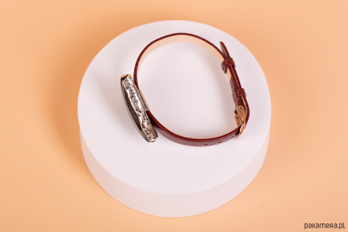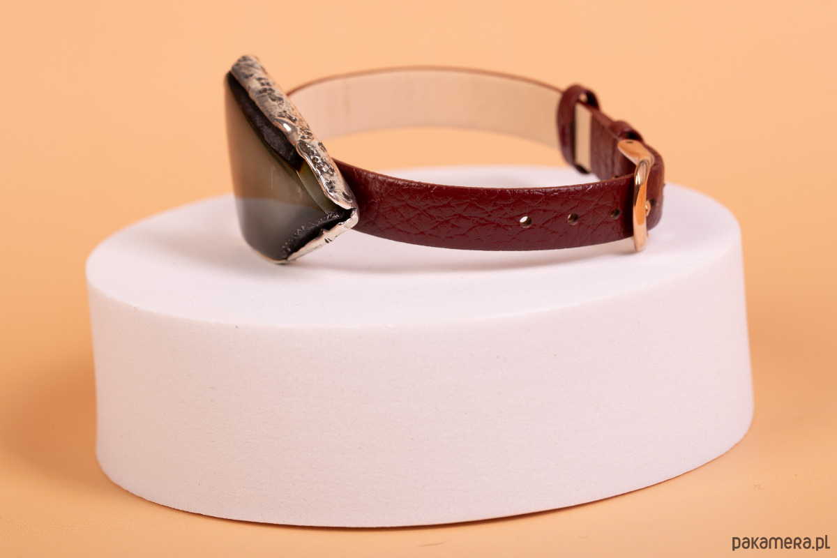 Srebro próby 925 · bursztyn bałtycki (naturalny) · pasek skórzany (burgundowy) z metalowymi elementami w kolorze złota · waga części ozdobnej 15 g · bursztyn 3,6 cm x 3 cm · wysokość bursztynu 0,7 cm · długość paska 23 cm · szerokość paska 1 cm