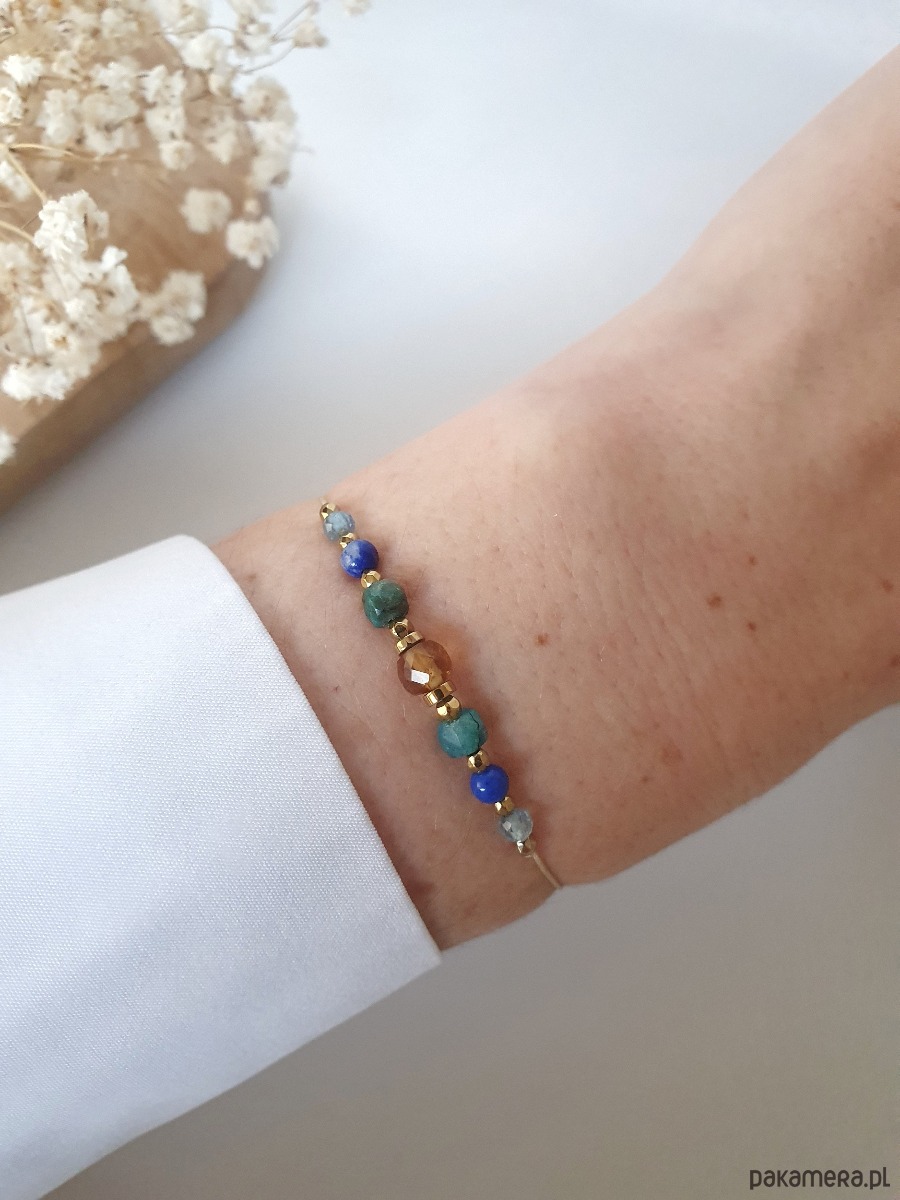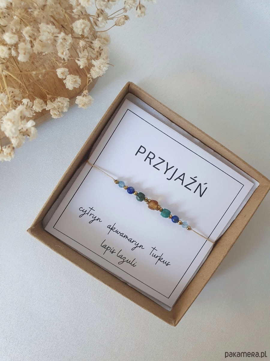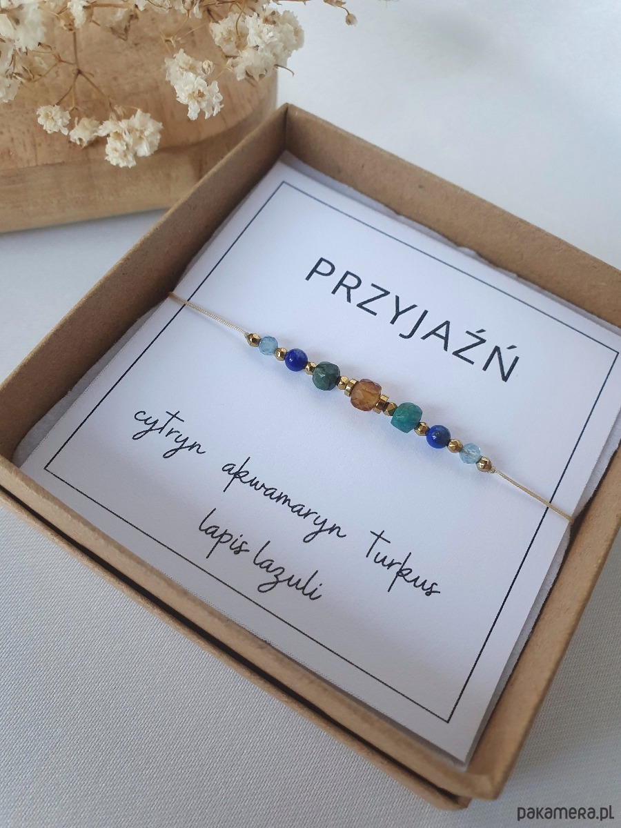 Delikatna bransoletka–talizman na przyjaźń, wykonana ręcznie z naturalnych kamieni: cytrynu, akwamarynu, turkusu i lapis lazuli. Każdy z nich symbolizuje inną formę wsparcia, tworząc wyjątkową kompozycję sprzyjającą harmonii i trwałym relacjom. Kamienie nawleczone są na wytrzymałą nić jubilerską, dzięki czemu bransoletka jest nie tylko piękna, ale także odporna na codzienne noszenie.