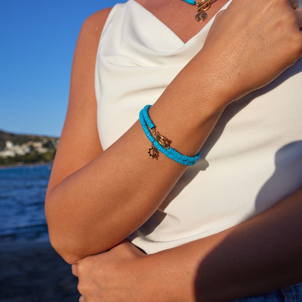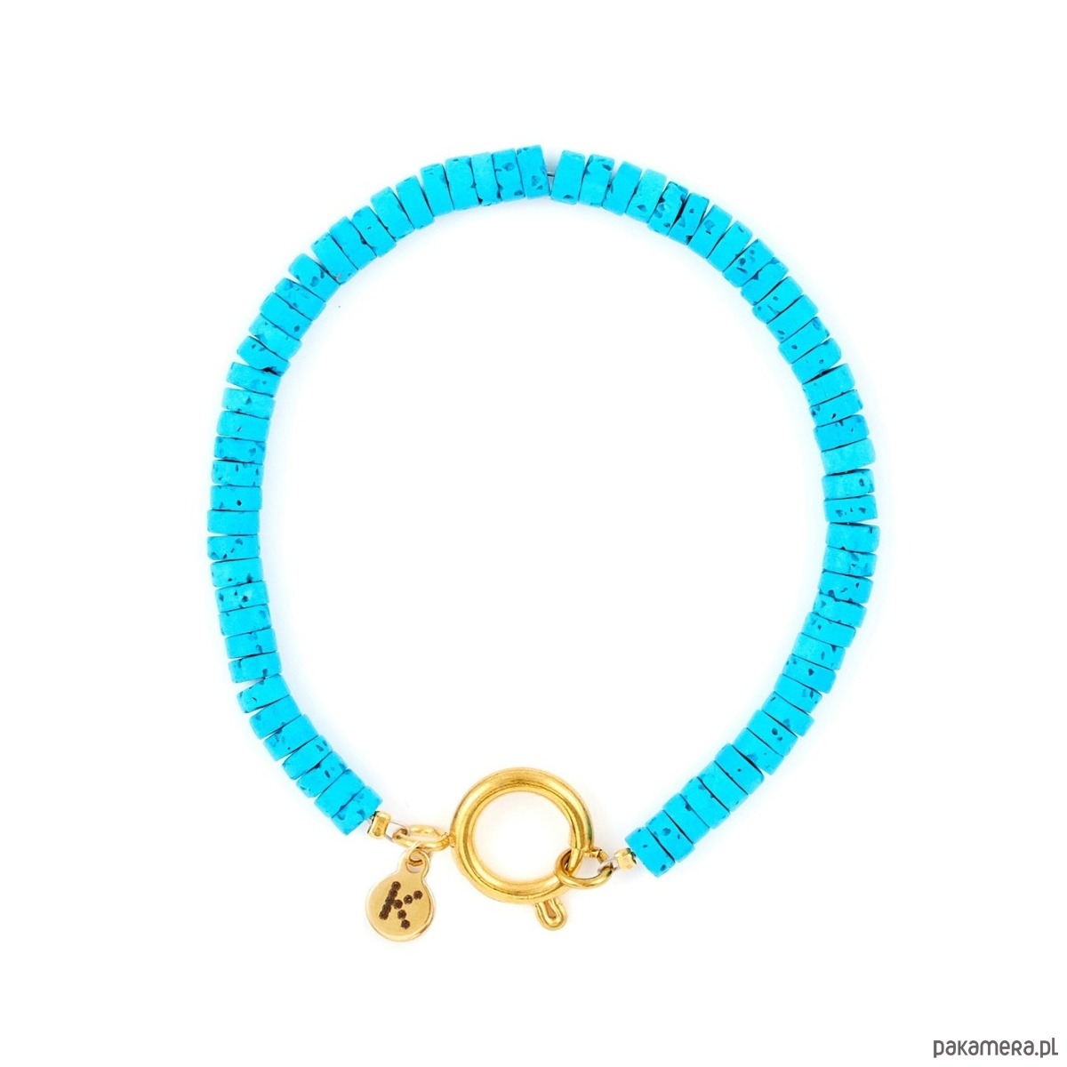Bransoletka wykonana jest z naturalnej lawy wulkanicznej dobarwianej kwarcem.