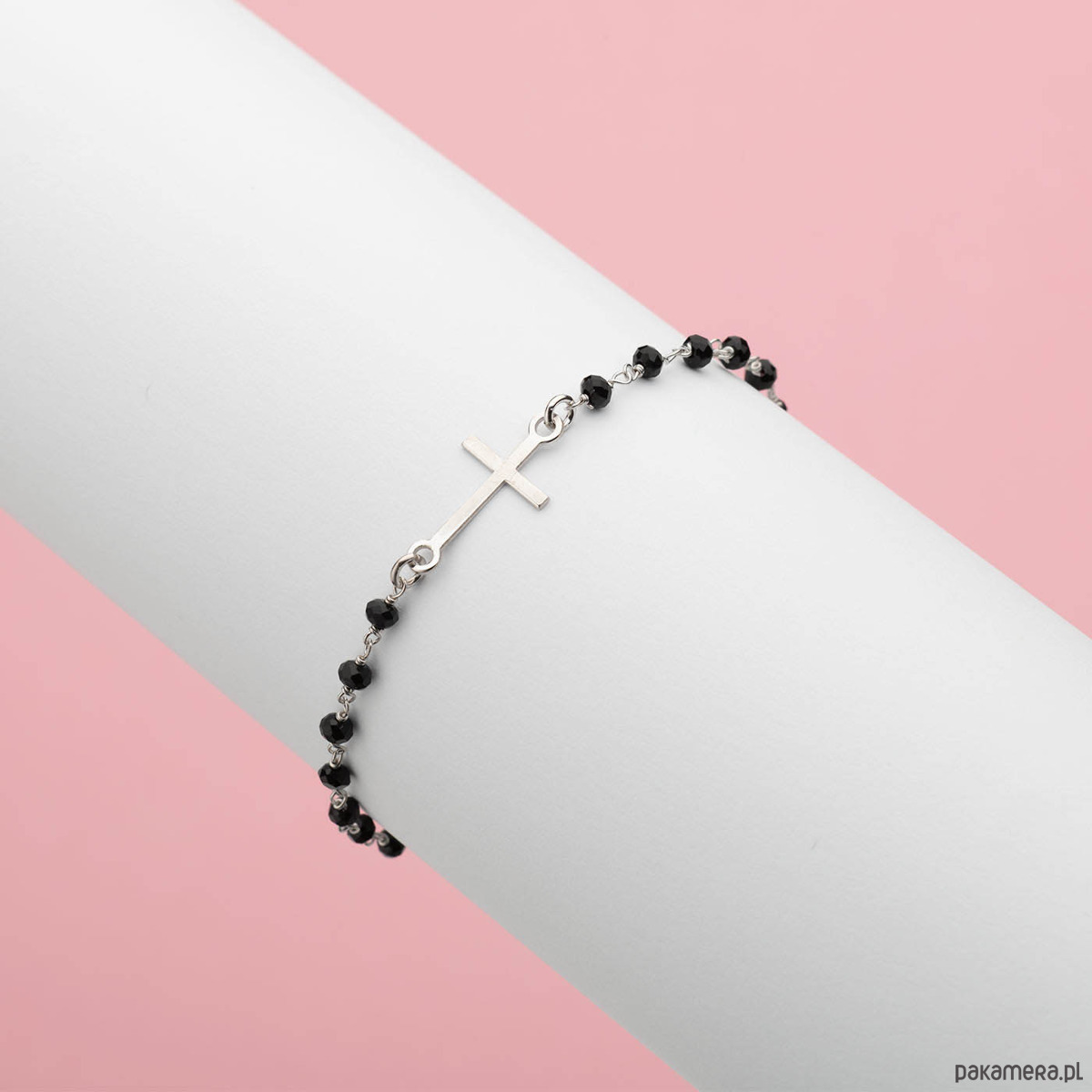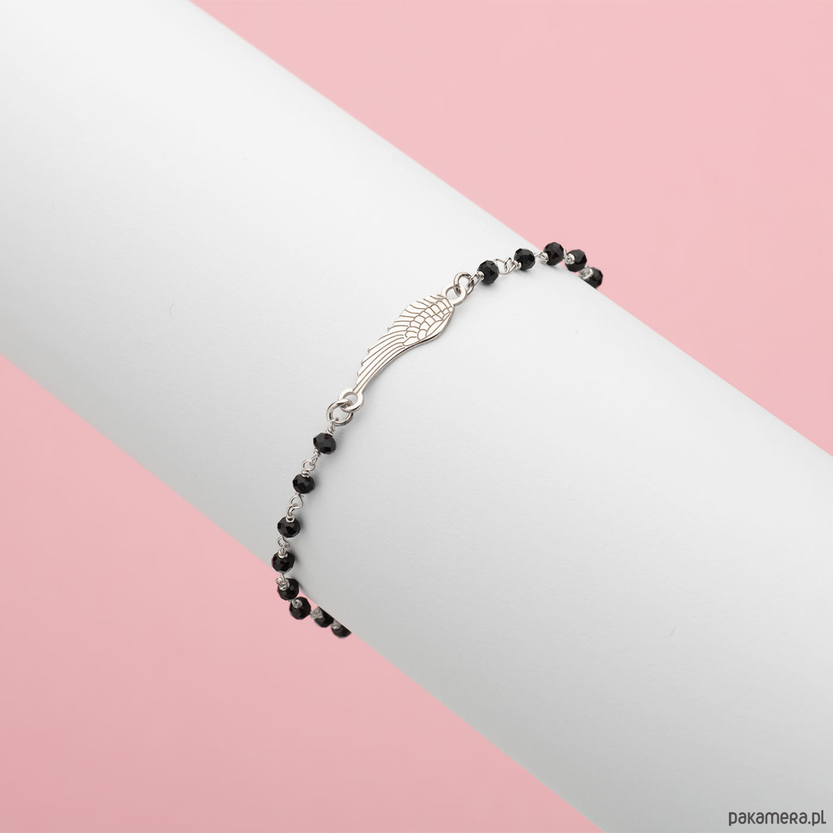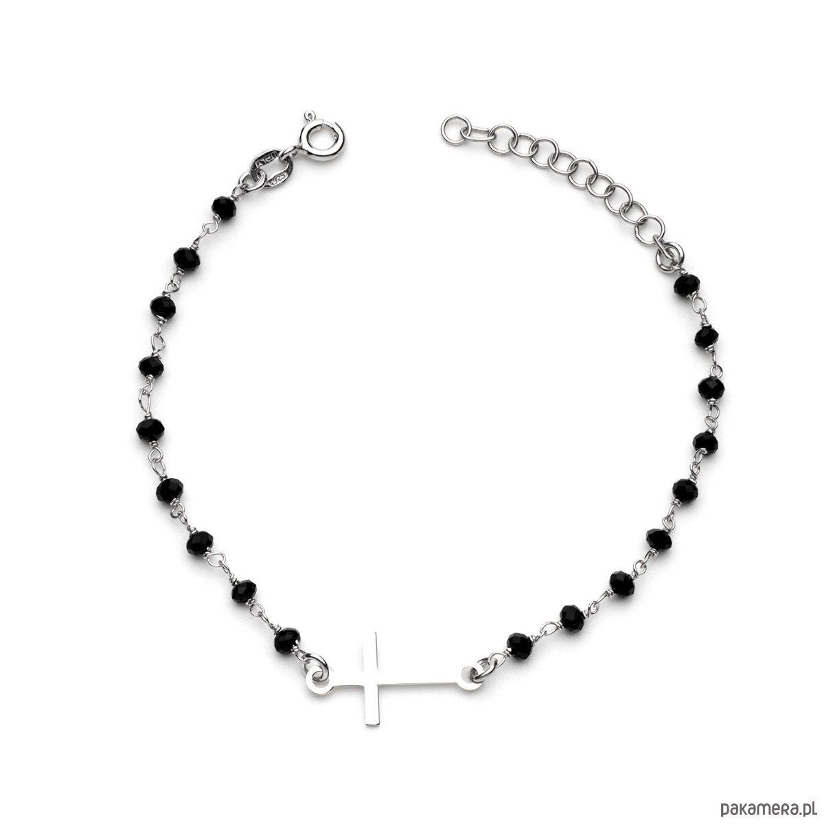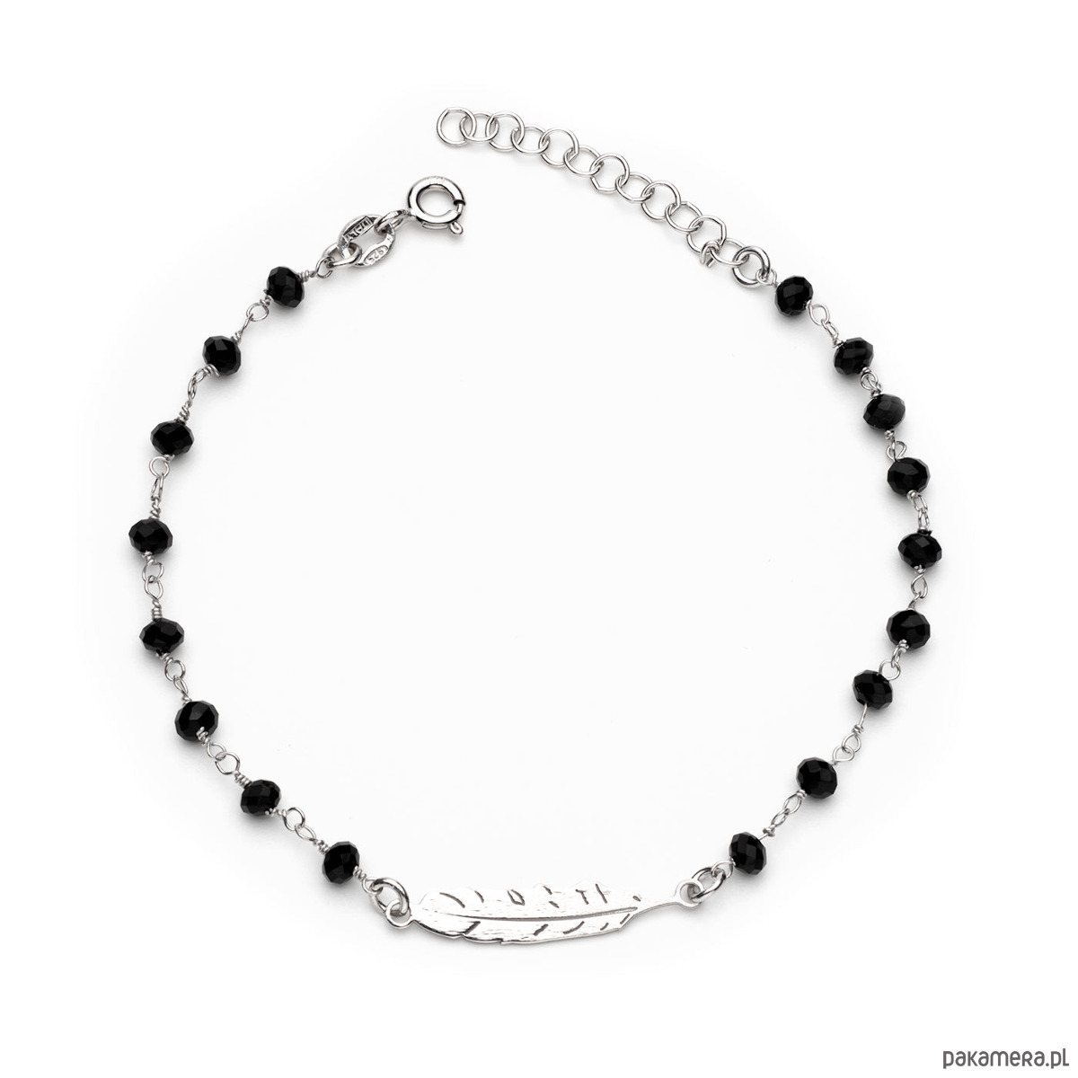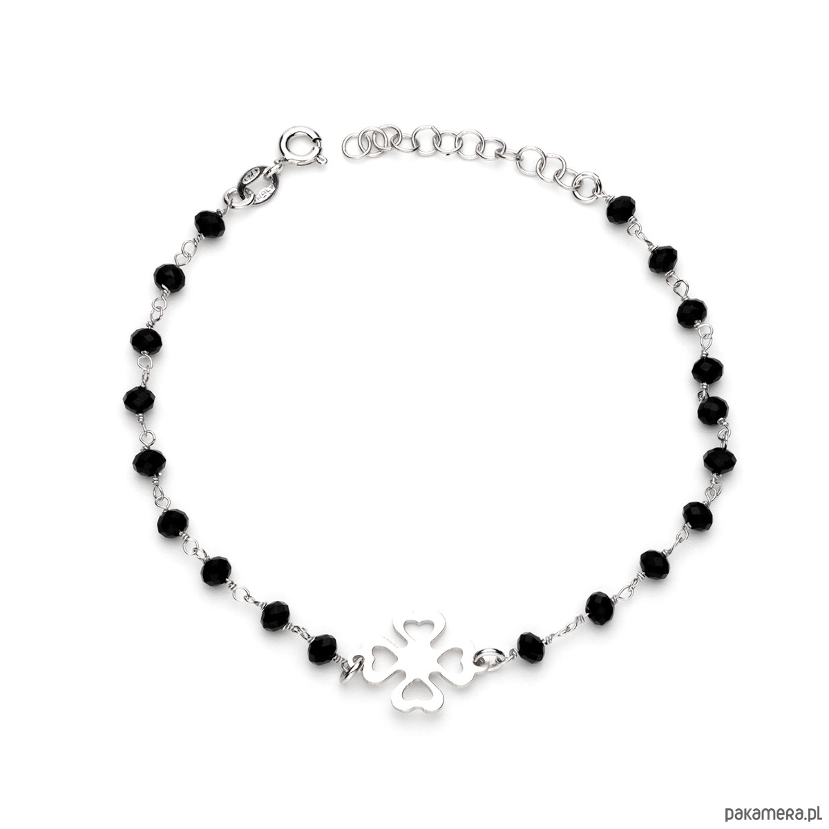 Bransoletka - Celebrytka na rękę - na szczęście. Delikatna bransoletka do wyboru z czterolistną koniczynką lub piórkiem lub krzyżykiem wykonana ze srebra 925 i małych koralików z onyksu, szlifowanych fasetkowo.