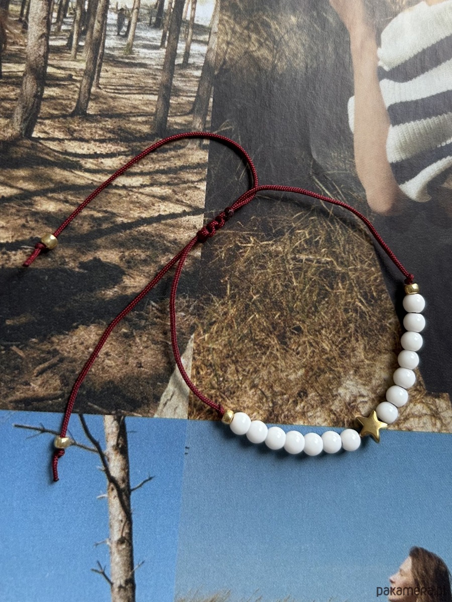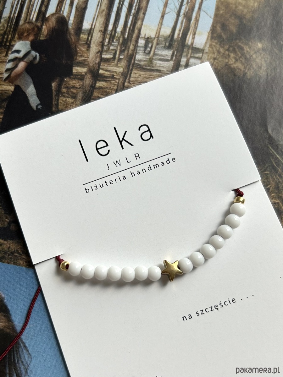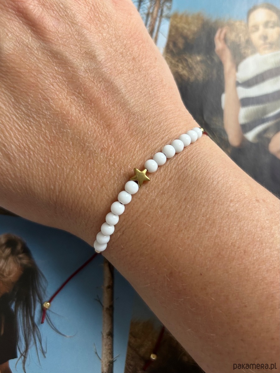 Wykonana z wytrzymałego sznurka jubilerskiego w bordowym kolorze oraz kamieni naturalnych: Agat biały oraz gwiazdka z Hematytu. Całość przepleciona złotymi koralikami Toho.