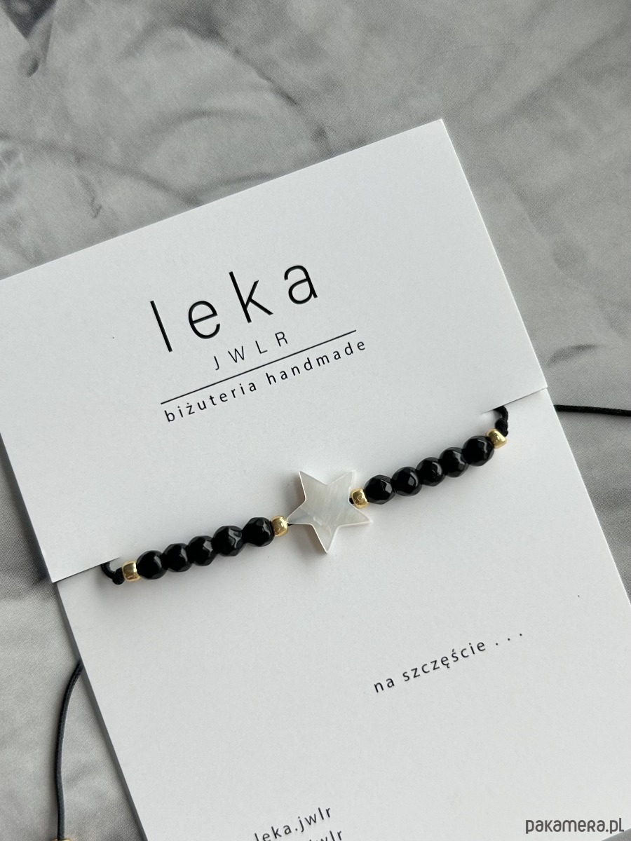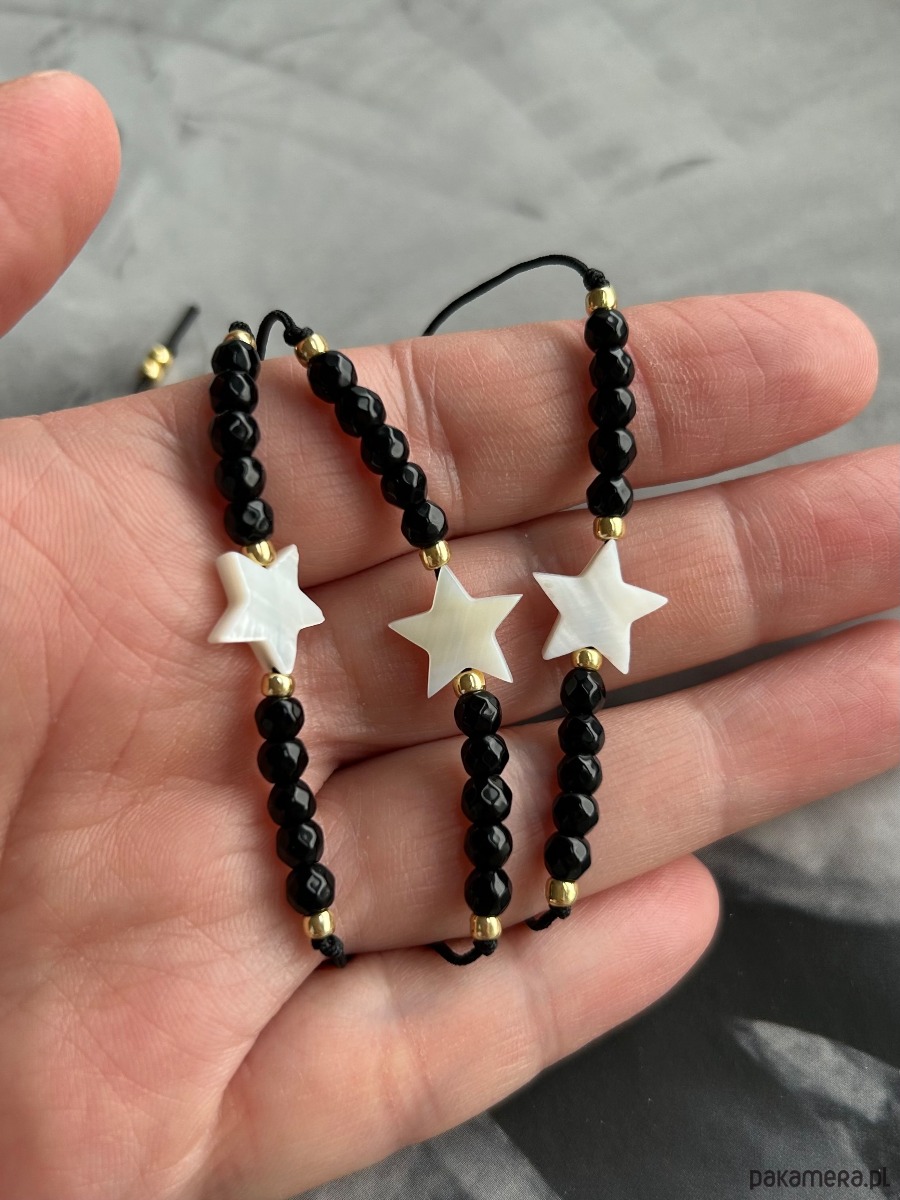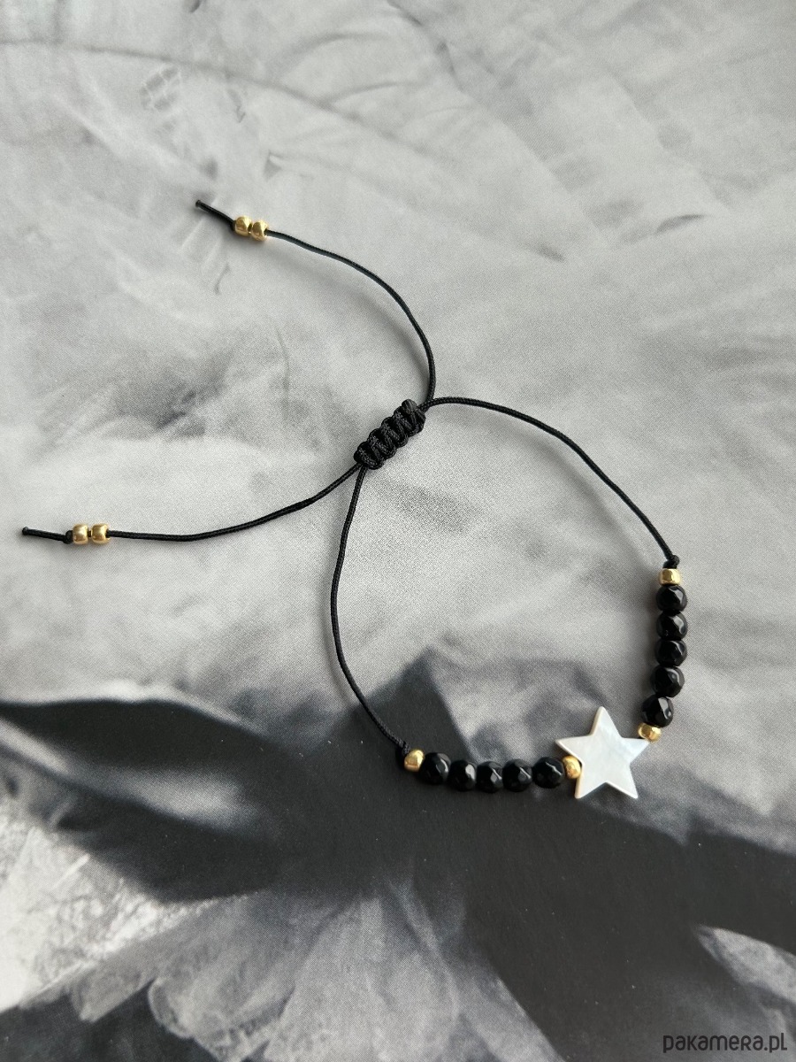 Wykonana z wytrzymałego sznurka jubilerskiego w czarnym kolorze oraz kamieni naturalnych: czarny Agat i gwiazdka z masy perłowej. Całość przepleciona złotymi koralikami Toho.