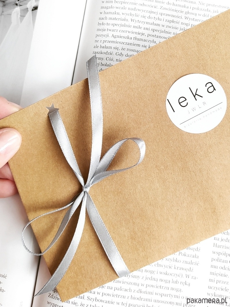 Biżuteria jest pakowana w tekturkę z logo marki oraz eko kopertę. Całość jest przepasana wstążką, a uzupełnienie to naklejki i etykieta z logo. Nadaje się na prezent.