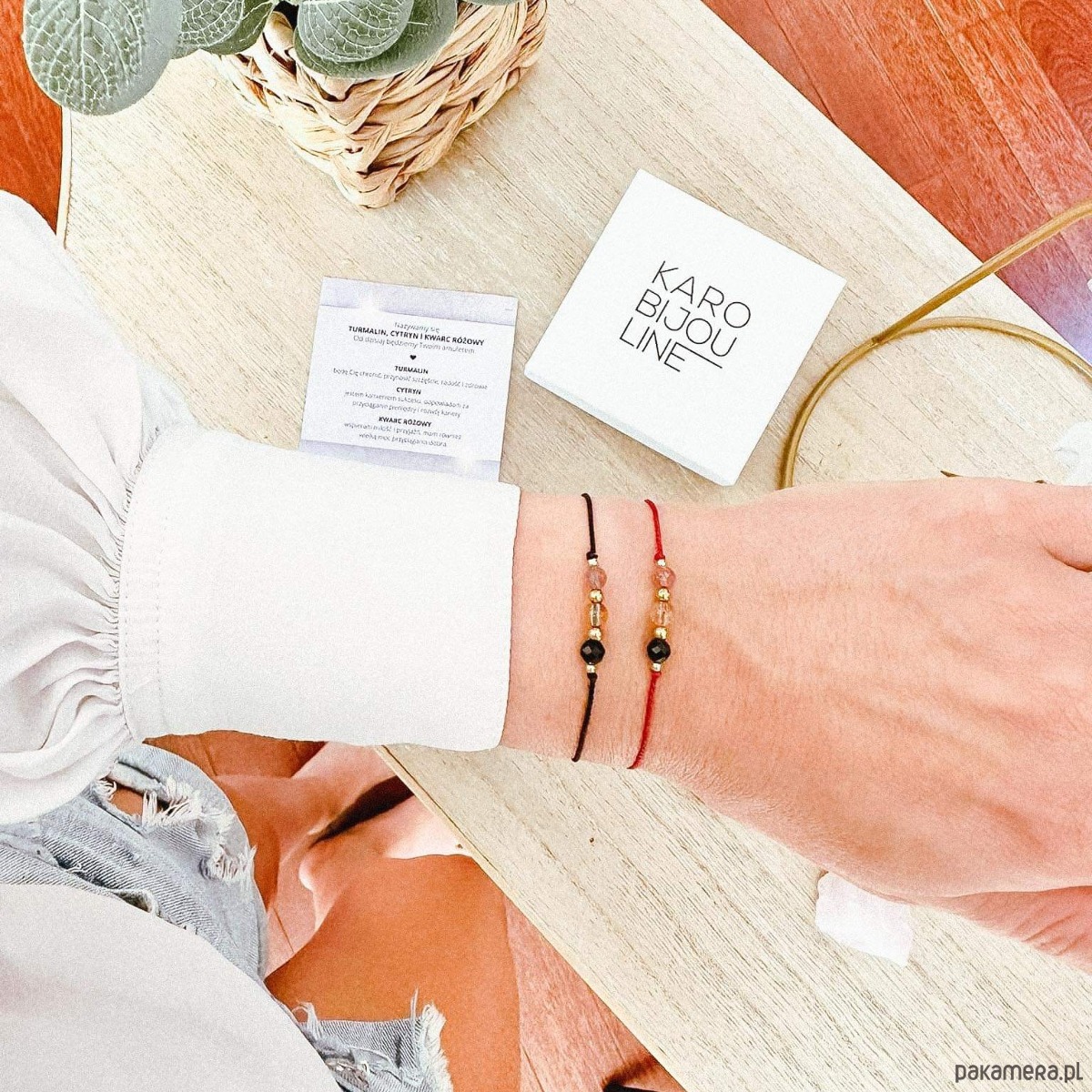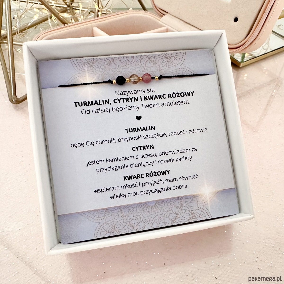 Turmalin, Cytryn i Kwarc różowy to naturalne kamienie posiadający niesamowite właściwości, które zostały opisane na karteczce dołączonej do bransoletki.