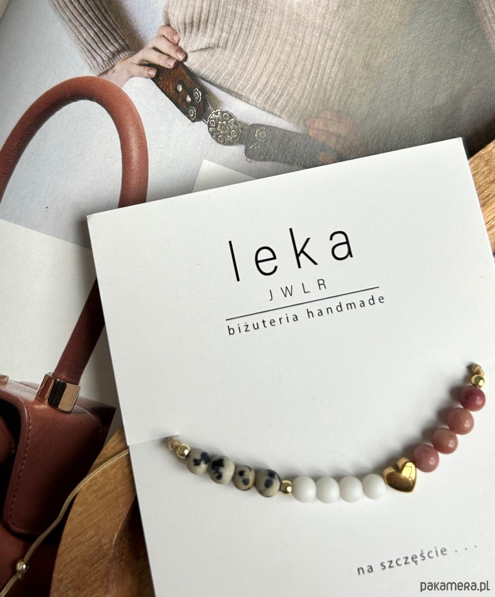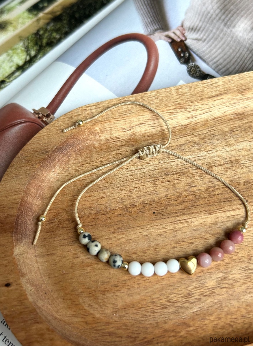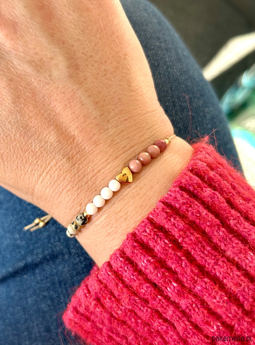 Wykonana z wytrzymałego sznurka jubilerskiego w cielistym kolorze oraz kamieni: Rodonitu, serduszka z Hematytu, białego matowego Agatu oraz Jaspisu Dalmatyńskiego. Całość przepleciona kulkami Hematyt w kolorze złota.