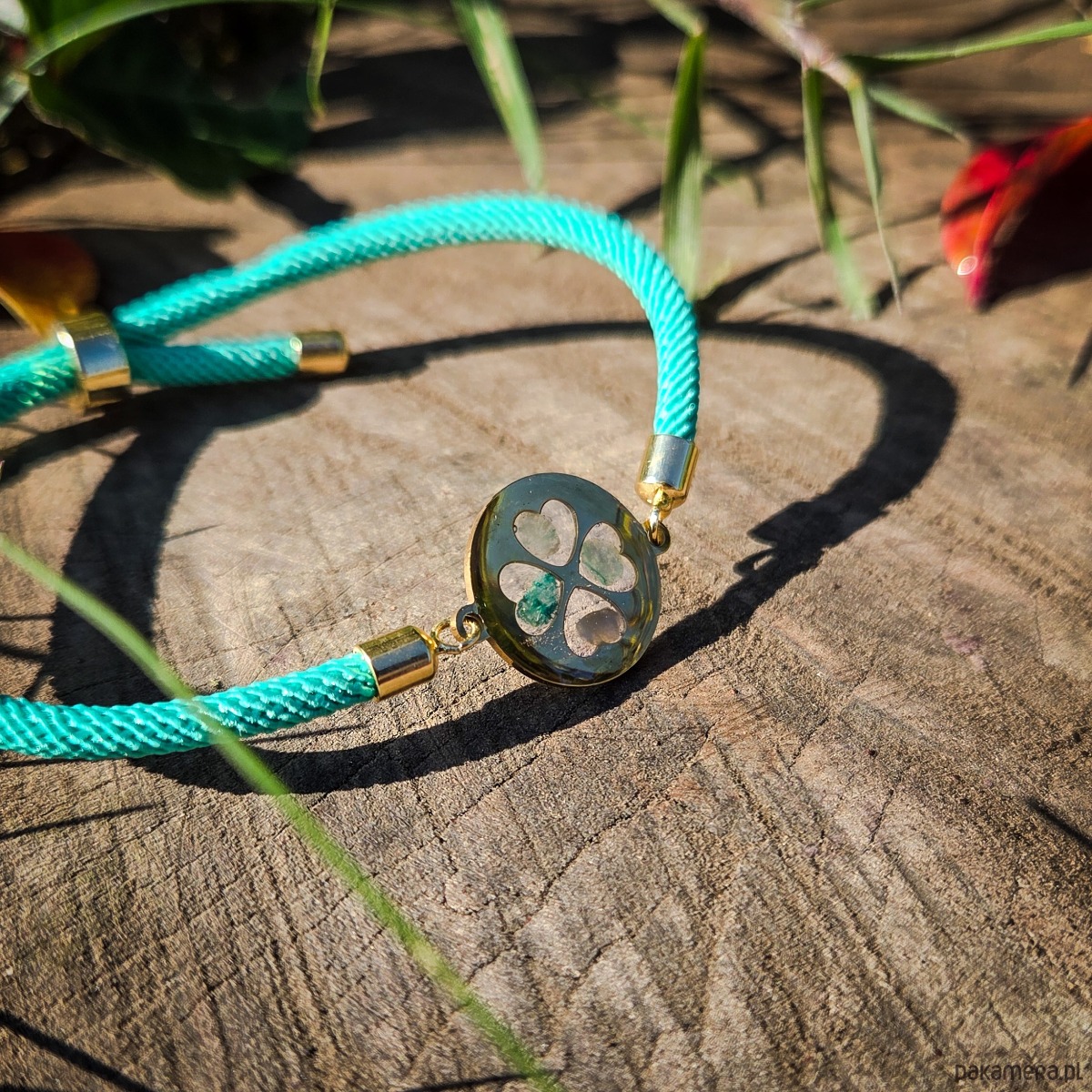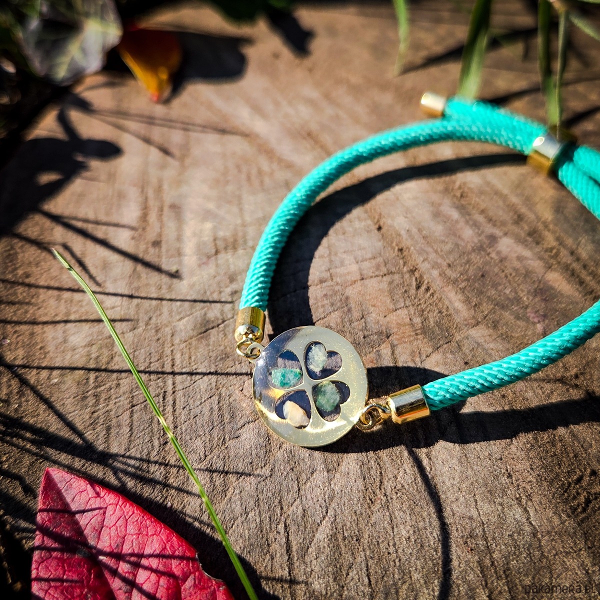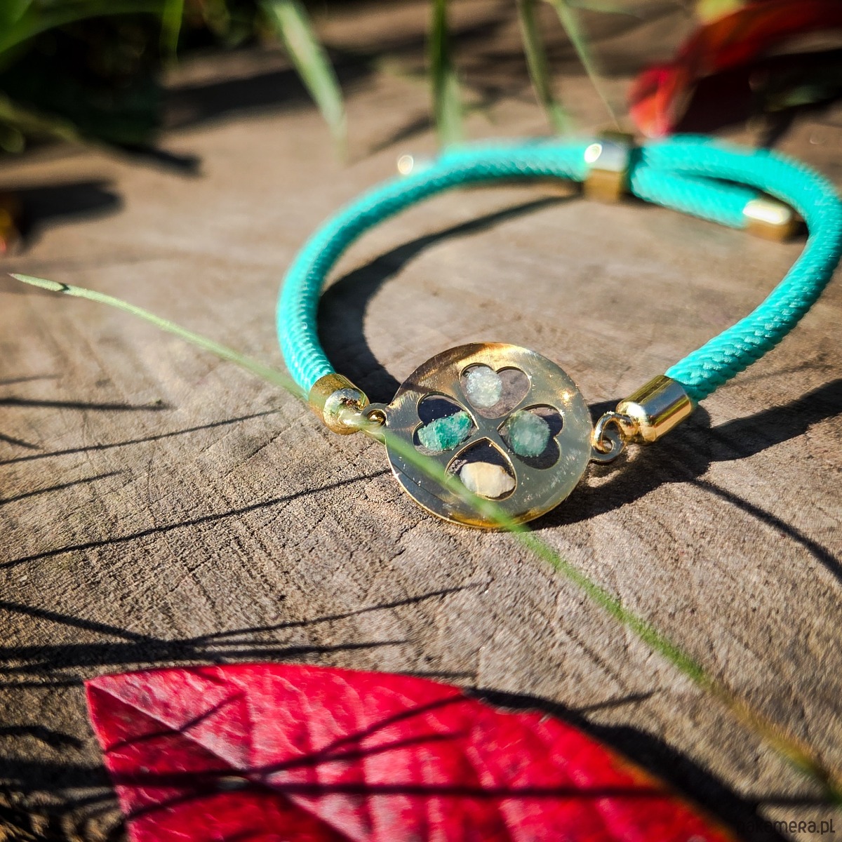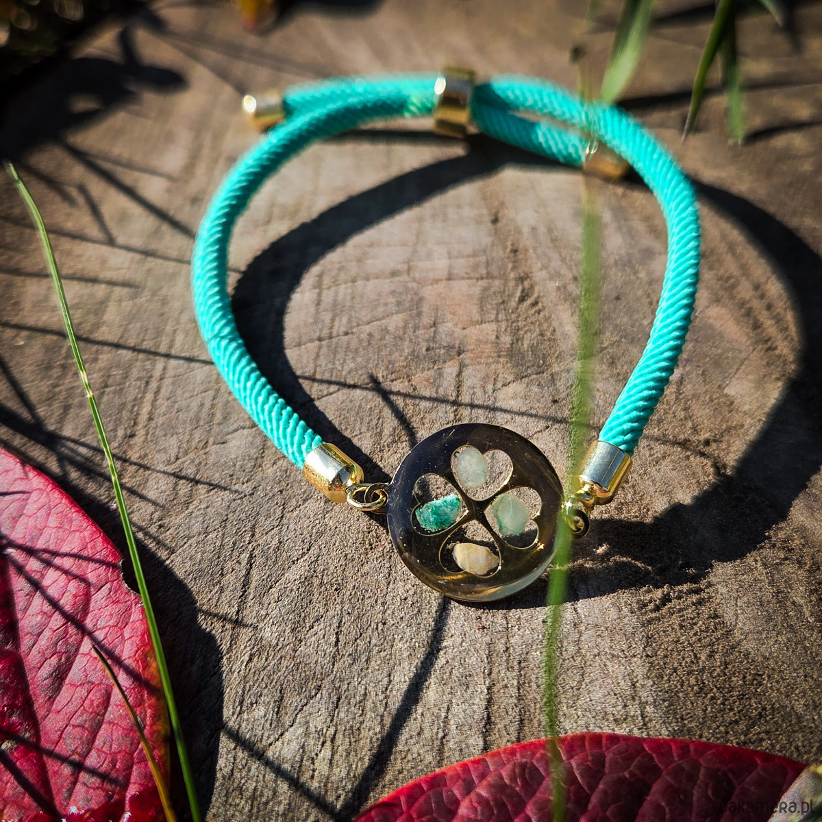 Bransoletka z oczkiem z zatopionym w żywicy epoksydowej amazonitem.