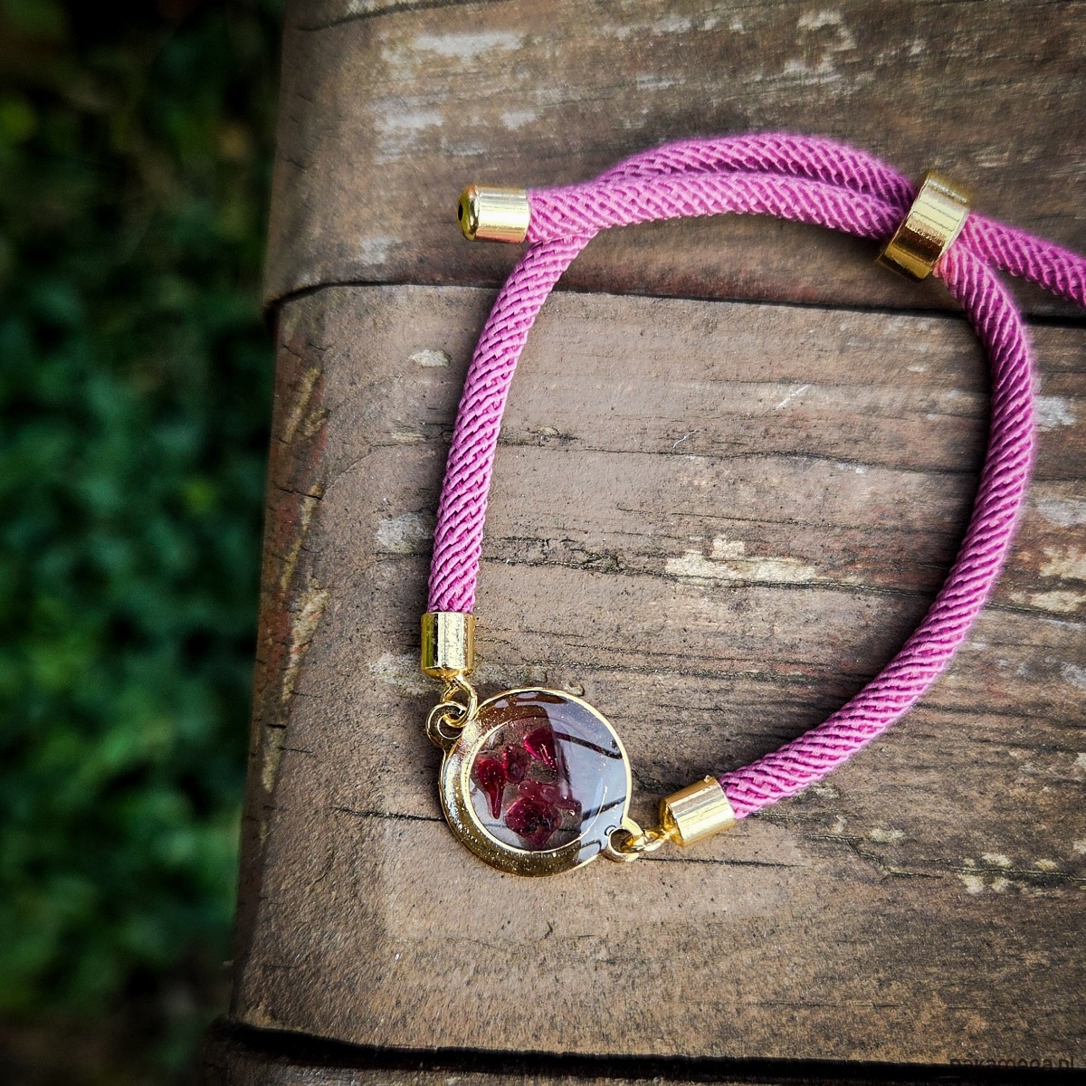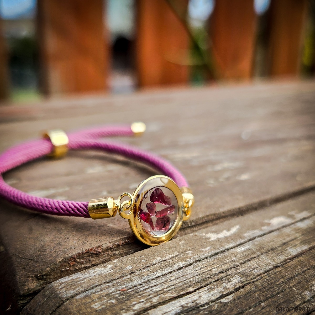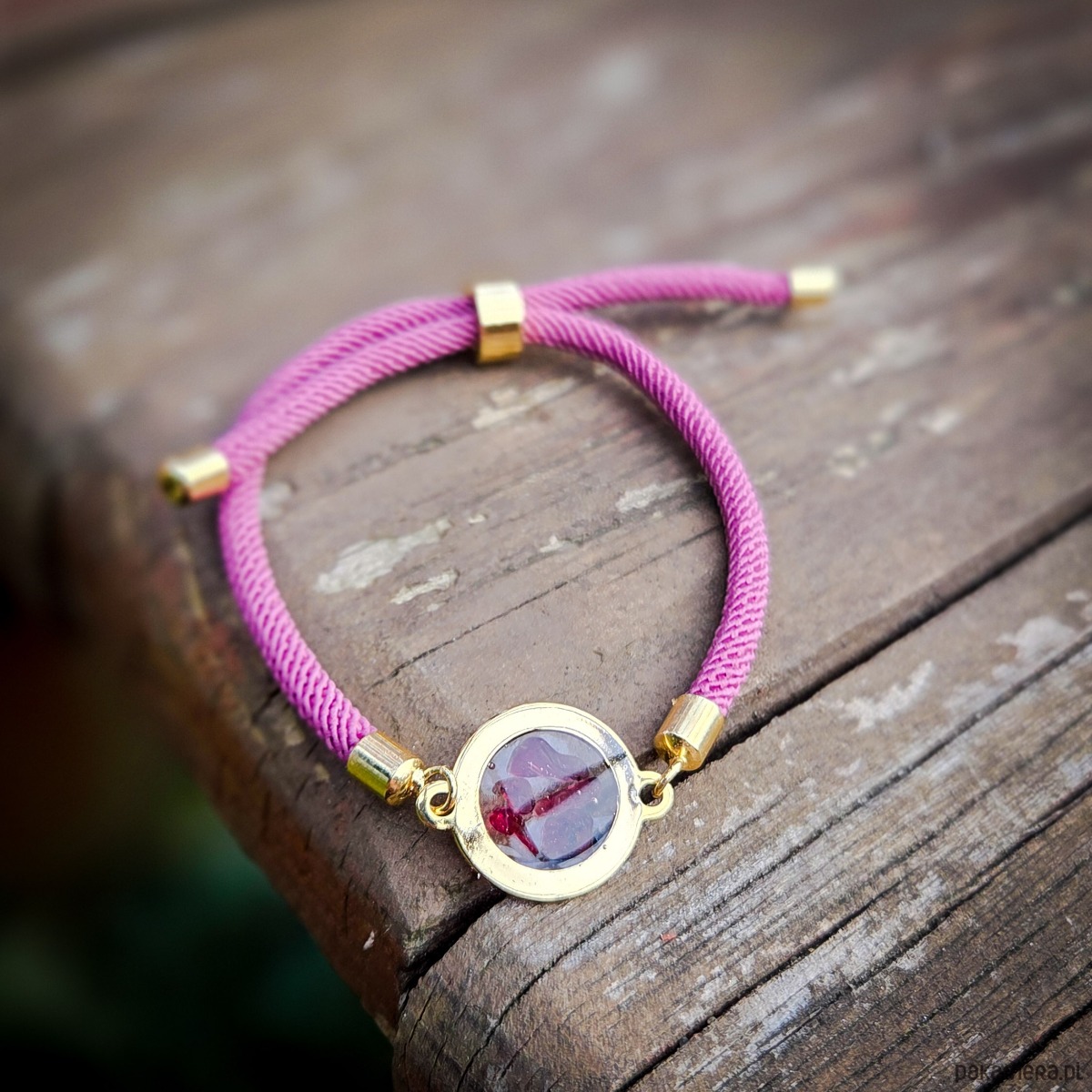 Bransoletka z oczkiem z zatopionym w żywicy epoksydowej granatem, kolor złoty.