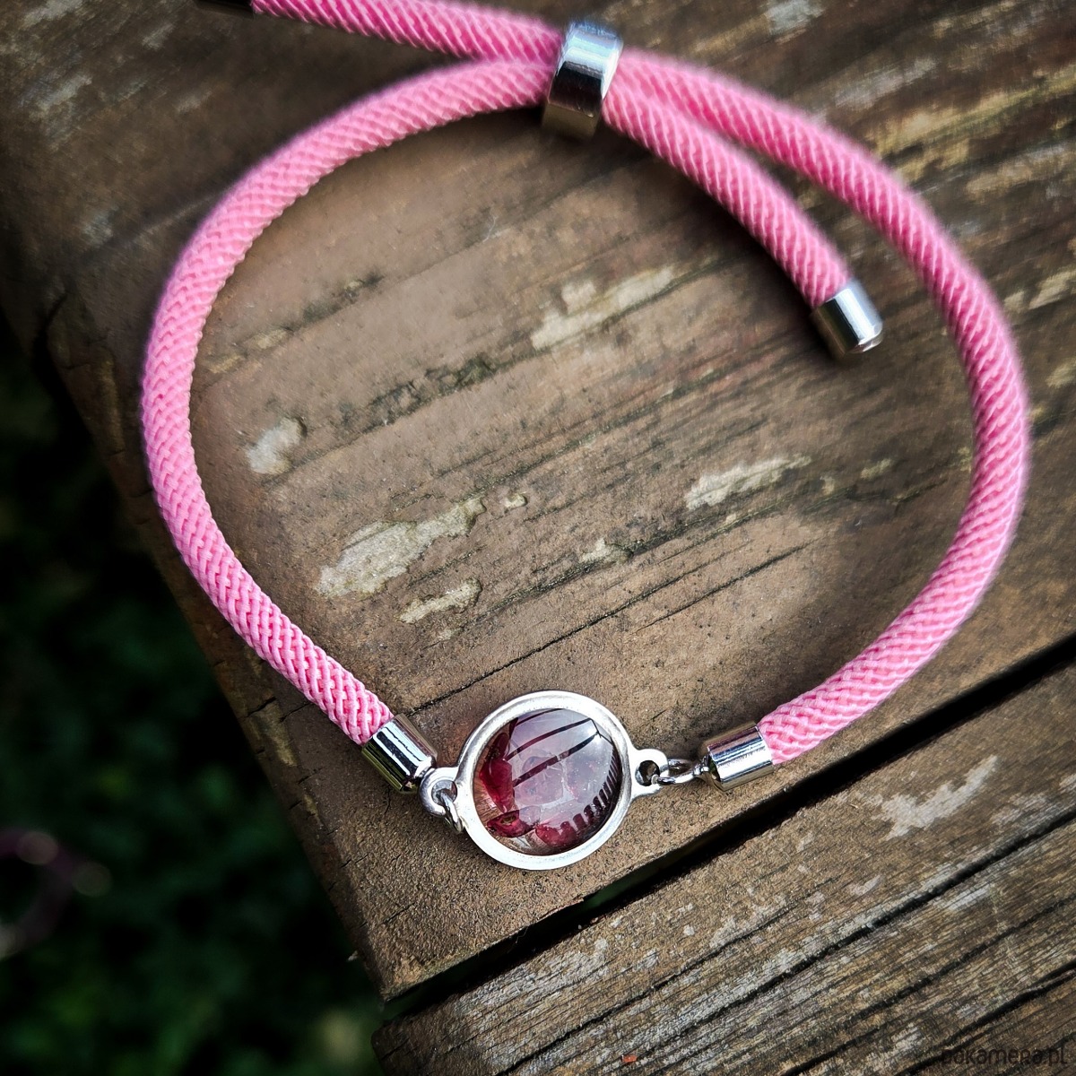 Bransoletka na zapięciu ze skręcanego sznurka. Zapięcie regulowane/przesuwane, długość sznurka: 11cm, średnica oczka: 12 mm, maksymalny obwód całek bransoletki ok 14 cm.
